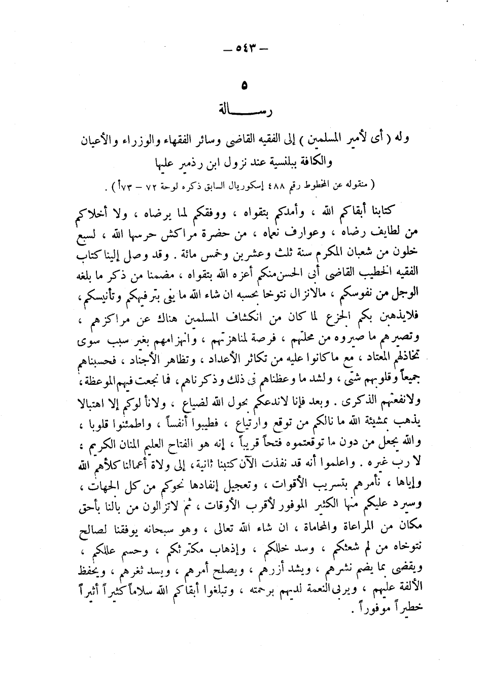 وله (أي لأمير المسلمين) إلى الفقيه القاضي وسائر الفقهاء والوزراء والأعيان والكافة ببلنسية عند نزول ابن رذمير عليها