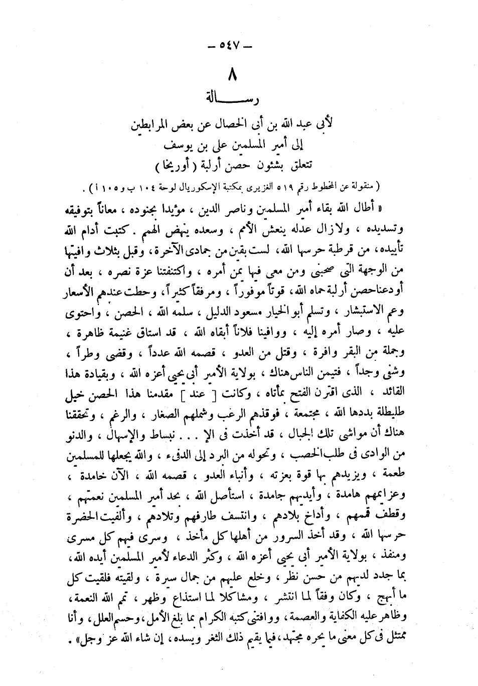 لأبى عبد الله بن أبى الخصال عن بعض المرابطين إلى أمير المسلمين علي بن يوسف تتعلق بشئون حصن أرلبة (أوريخا)