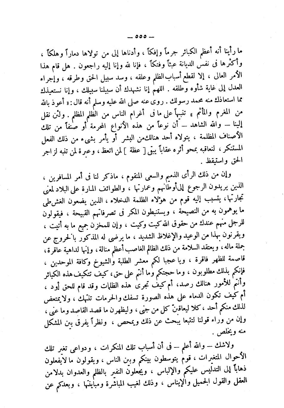 ما رأينا أنه أعظم الكبائر جرماً وإفكاً، وأدناها إلى من تولاها دماراً وهلكاً، وأكثرها في نفس الديانة عبثاً وفتكاً، فإنا لله وإنا إليه راجعون. هل قام هذا الأمر العالي، إلا لقطع أسباب الظلم وعلقه، وسد سبيل الحق وطرقه، وإجراء العدل إلى غاية شأوه وطلقه. اللهم إنا نشهدك أن سبيلنا سبيلك، وإنا نستعيذك مما استعاذك منه محمد رسولك. روى عنه صلى الله عليه وسلم أنه قال: " أعوذ بالله من المغرم والمأثم " تنبيهاً على ما في أغرام الناس من الظلم المظلم. ولئن نقل إلينا - والله الشاهد - أن نوعاً من هذه الأنواع المحرمة أو صنفاً من تلك الأصناف المظلمة، يتولاه أحد هنالك من البشر أو يأمر بشىء من ذلك الفعل المستنكر، لنعاقبه بمحو أثره عقاباً يبقى [عظة] لمن اتعظ، وعبرة لمن تنبه لزاجر الحق واستيقظ.