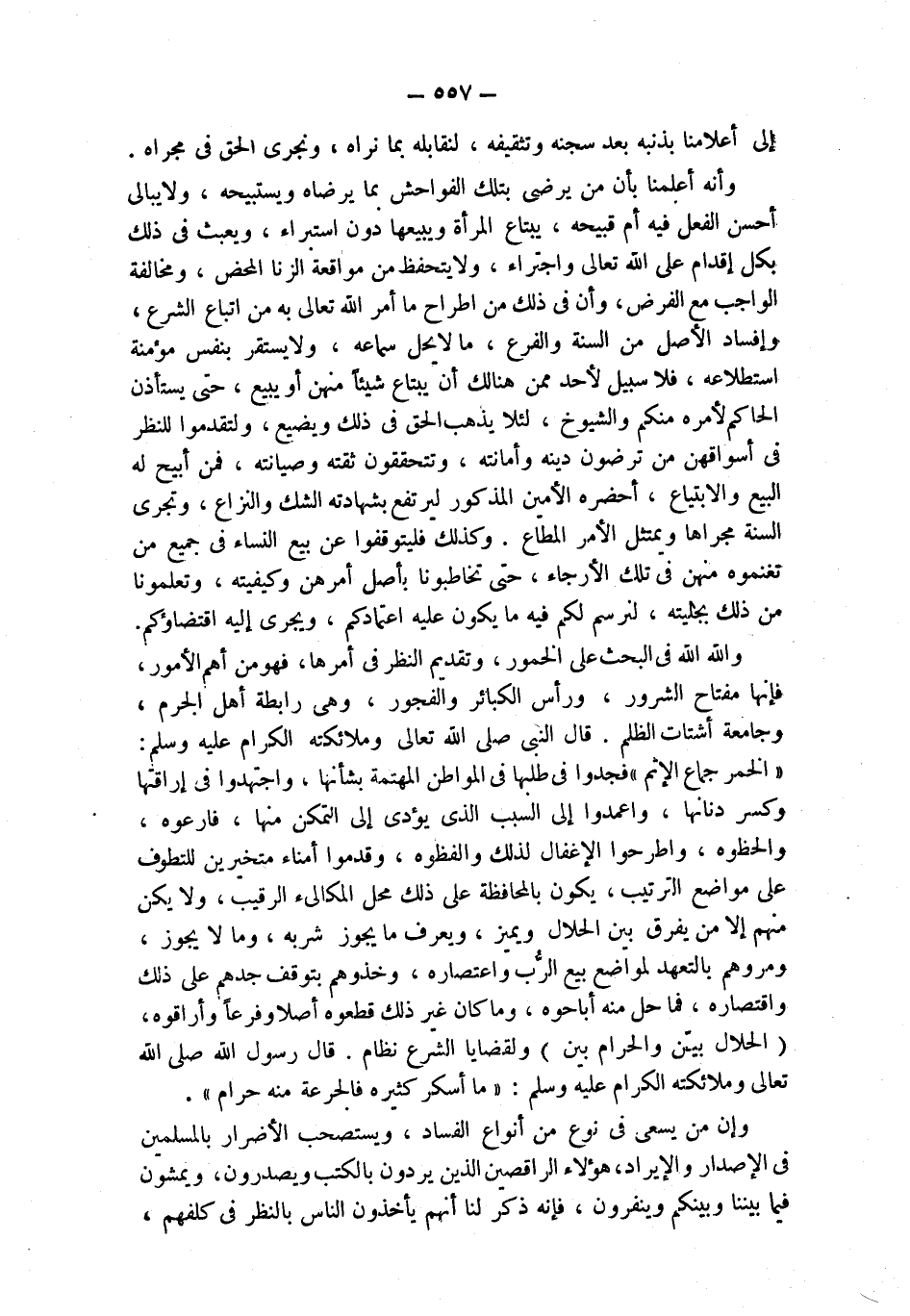 والله الله في البحث على الخمور، وتقديم النظر في أمرها، فهو من أهم الأمور، فإنها مفتاح الشرور، ورأس الكبائر والفجور، وهي رابطة أهل الجرم، وجامعة أشتات الظلم. قال النبي صلى الله تعالى وملائكته الكرام عليه وسلم: " الخمر جماع الإثم " فجدوا في طلبها في المواطن المتهمة بشأنها، واجتهدوا في إراقتها وكسر دنانها، واعمدوا إلى السبب الذي يؤدي إلى التمكن منها، فارعوه، والحظوه، واطرحوا الإغفال لذلك والفظوه، وقدموا أمناء متخيرين للتطوف على مواضع الترتيب، يكون بالمحافظة على ذلك محل المكالىء الرقيب، ولا يكن منهم إلا من يفرق بين الحلال ويميز، ويعرف ما يجوز شربه، وما لا يجوز، ومروهم بالتعهد لمواضع بيع الرُّب واعتصاره، وخذوهم بتوقف جدهم على ذلك واقتصاره، فما حل منه أباحوه، وما كان غير ذلك قطعوه أصلا وفرعاً وأراقوه، (الحلال بيّن والحرام بيّن) ولقضايا الشرع نظام. قال رسول الله صلى الله تعالى وملائكته الكرام عليه وسلم: " ما أسكر كثيره فالجرعة منه حرام ".