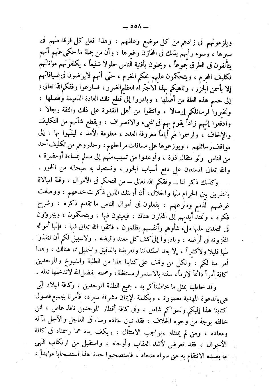 وقد خاطبنا بمثل ما خاطبناكم به، جميع الطلبة الموحدين، وكافة البلاد التي هي بالدعوة المهدية معمورة، وبكلمة الإيمان مشرقة منيرة، فأمرنا بجميع فصول كتابنا هذا إليكم ولسواكم شامل، وفي كافة أقطار الموحدين نافذ عامل، فمن خالفه بوجه من وجوه الخلاف، فقد تبين عناده وساء في العاجل والآجل مآله ومعاده، ومن لم يمتثله، بواجب الامتثال، ويكف يده عما رسمناه في كافة الأحوال، فقد تعرض لأشد العقاب وأوحاه، واستقبل من ارتكاب النهي ما يصده الانتقام به عن سواه منحاه، فاستصحبوا حدنا هذا استصحاباً مؤيداً،