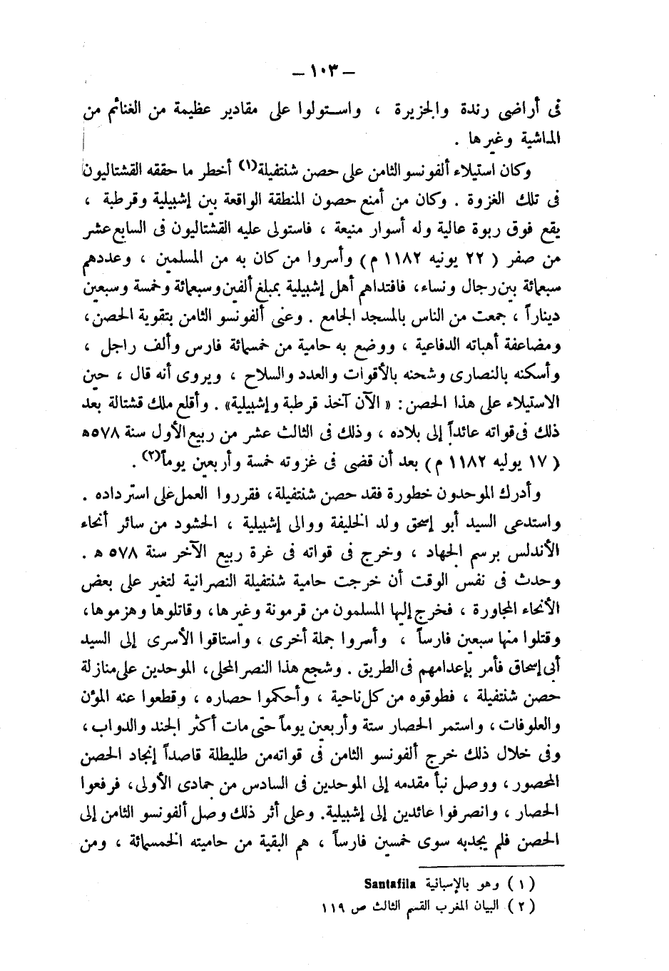 في أراضي رندة والجزيرة، واستولوا على مقادير عظيمة من الغنائم من الماشية وغيرها. وكان استيلاء ألفونسو الثامن على حصن شنتفيلة (¬1) أخطر ما حققه القشتاليون في تلك الغزوة. وكان من أمنع حصون المنطقة الواقعة بين إشبيلية وقرطبة، يقع فوق ربوة عالية وله أسوار منيعة، فاستولى عليه القشتاليون في السابع عشر من صفر (22 يونيه 1182 م) وأسروا من كان به من المسلمين، وعددهم سبعمائة بين رجال ونساء، فافتداهم أهل إشبيلية بمبلغ ألفين وسبعمائة وخمسة وسبعين ديناراً، جمعت من الناس بالمسجد الجامع. وعنى ألفونسو الثامن بتقوية الحصن، ومضاعفة أهباته الدفاعية، ووضع به حامية من خمسمائة فارس وألف راجل، وأسكنه بالنصارى وشحنه بالأقوات والعدد والسلاح، ويروى أنه قال، حين الاستيلاء على هذا الحصن: " الآن آخذ قرطبة وإشبيلية ". وأقلع ملك قشتالة بعد ذلك في قواته عائداً إلى بلاده، وذلك في الثالث عشر من ربيع الأول سنة 578 هـ (17 يوليه 1182 م) بعد أن قضى في غزوته خمسة وأربعين يوماً (¬2).