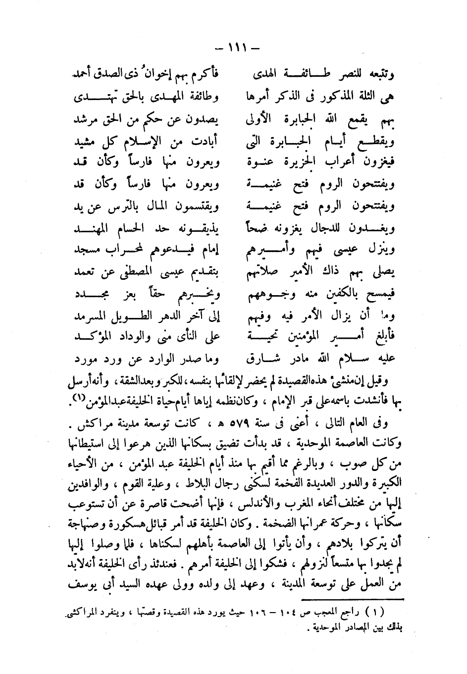 (¬1) راجع المعجب ص 104 - 106 حيث يورد هذه القصيدة وقصتها، وينفرد المراكشي بذلك بين المصادر الموحدية.