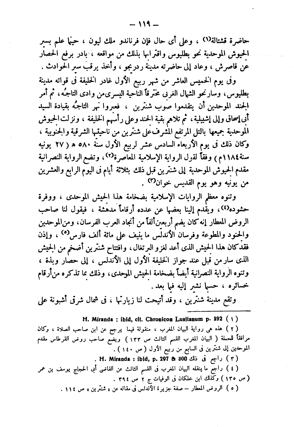 (¬2) هذه هي رواية البيان المغرب، منقولة فيما يرجح عن ابن صاحب الصلاة، وكان مرافقاً للحملة (البيان المغرب القسم الثالث ص 133) ويضع صاحب روض القرطاس مقدم الموحدين إلى شنترين في السابع من ربيع الأول (ص 140).