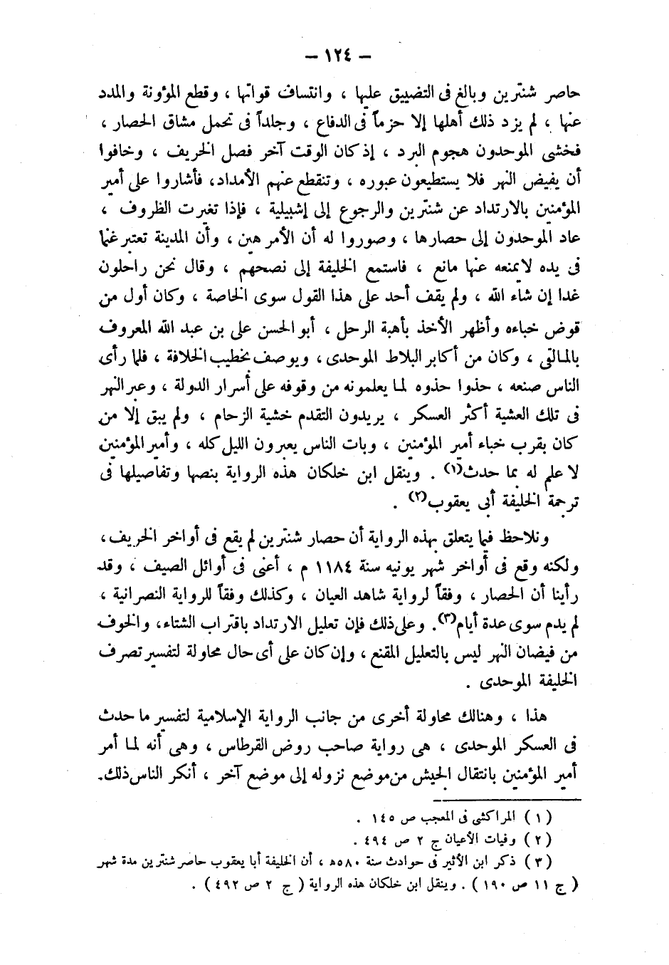 ونلاحظ فيما يتعلق بهذه الرواية أن حصار شنترين لم يقع في أواخر الخريف، ولكنه وقع أواخر شهر يونيه سنة 1184 م، أعني في أوائل الصيف، وقد رأينا أن الحصار، وفقاً لرواية شاهد العيان، وكذلك وفقاً للرواية النصرانية، لم يدم سوى عدة أيام (¬3). وعلى ذلك فإن تعليل الارتداد باقتراب الشتاء، والخوف من فيضان النهر ليس بالتعليل المقنع، وإن كان على أي حال محاولة لتفسير تصرف الخليفة الموحدي.