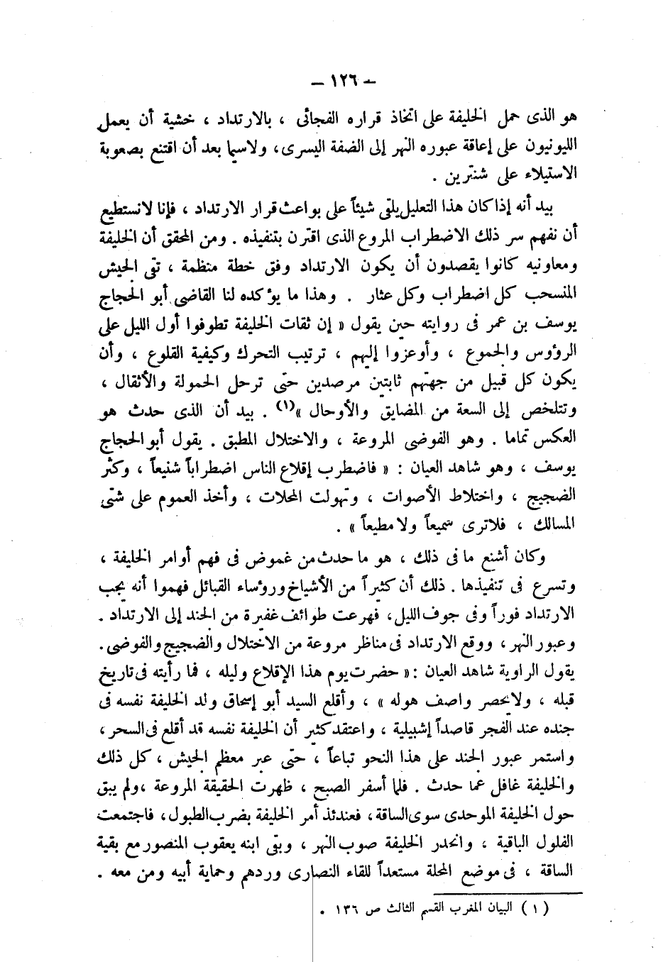 وكان أشنع ما في ذلك، هو ما حدث من غموض في فهم أوامر الخليفة، وتسرع في تنفيذها. ذلك أن كثيراً من الأشياخ ورؤساء القبائل فهموا أنه يجب الارتداد فوراً وفي جوف الليل، فهرعت طوائف غفيرة من الجند إلى الارتداد.