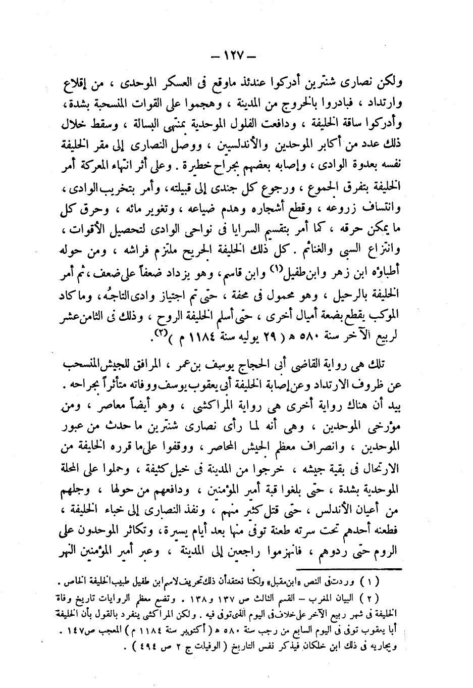 (¬2) البيان المغرب - القسم الثالث ص 137 و 138. وتضع معظم الروايات تاريخ وفاة الخليفة في شهر ربيع الآخر على خلاف في اليوم الذي توفي فيه. ولكن المراكشي ينفرد بالقول بأن الخليفة أبا يعقوب توفي في اليوم السابع من رجب سنة 580 هـ (أكتوبر سنة 1184 م) المعجب ص 147.