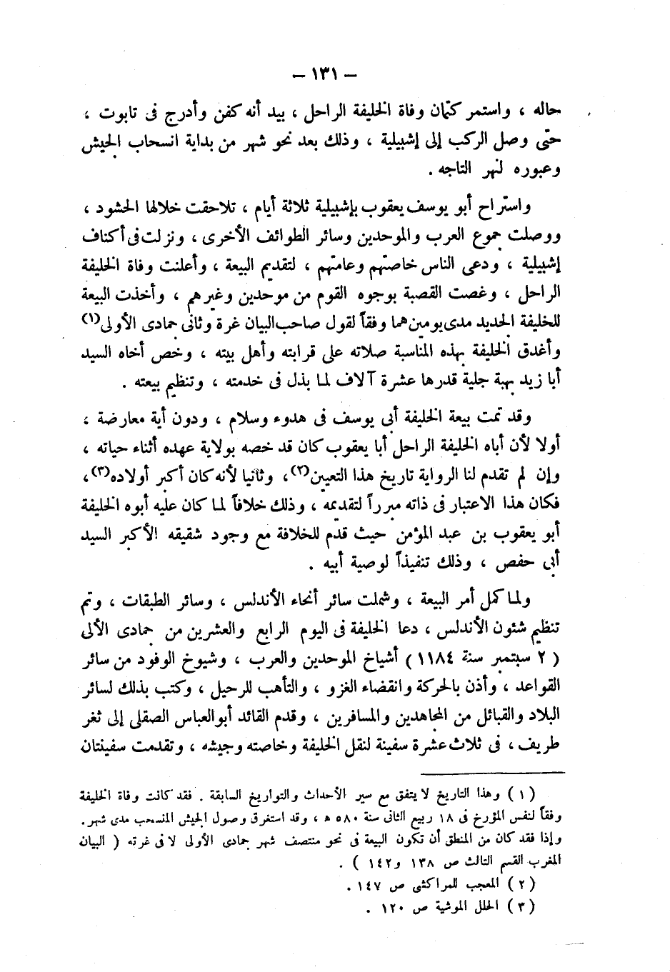 (¬1) وهذا التاريخ لا يتفق مع سير الأحداث والتواريخ السابقة. فقد كانت وفاة الخليفة وفقاً لنفس المؤرخ في 18 ربيع الثاني سنة 580 هـ، وقد استغرق وصول الجيش المنسحب مدى شهر.