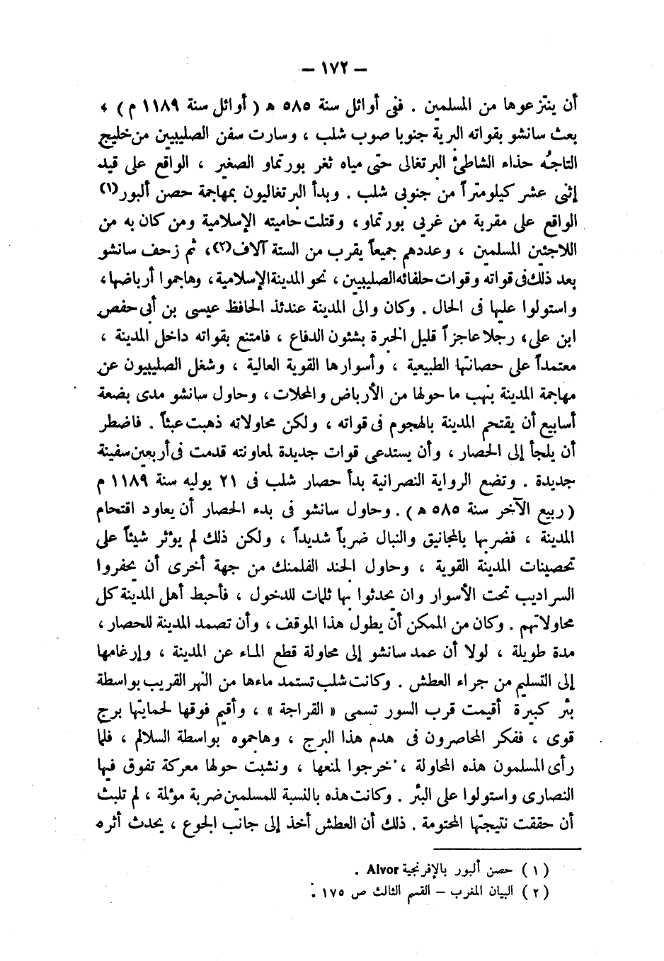 أن ينتزعوها من المسلمين. ففي أوائل سنة 585 هـ (أوائل سنة 1189 م)، بعث سانشو بقواته البرية جنوباً صوب شلب، وسارت سفن الصليبيين من خليج التاجُه حذاء الشاطىء البرتغالي حتى مياه ثغر بورتماو الصغير، الواقع على قيد إثنى عشر كيلومتراً من جنوبي شلب. وبدأ البرتغاليون بمهاجمة حصن ألبور (¬1) الواقع على مقربة من غربي بورتماو، وقتلت حاميته الإسلامية ومن كان به من اللاجئين المسلمين، وعددهم جميعاً يقرب من الستة آلاف (¬2)، ثم زحف سانشو بعد ذلك في قواته وقوات حلفائه الصليبيين، نحو المدينة الإسلامية، وهاجموا أرباضها، واستولوا عليها في الحال. وكان والي المدينة عندئذ الحافظ عيسى بن أبي حفص ابن علي، رجلا عاجزاً قليل الخبرة بشئون الدفاع، فامتنع بقواته داخل المدينة، معتمداً على حصانتها الطبيعية، وأسوارها القوية العالية، وشغل الصليبيون عن مهاجمة المدينة بنهب ما حولها من الأرباض والمحلات، وحاول سانشو مدى بضعة أسابيع أن يقتحم المدينة بالهجوم في قواته، ولكن محاولاته ذهبت عبثاً. فاضطر أن يلجأ إلى الحصار، وأن يستدعي قوات جديدة لمعاونته قدمت في أربعين سفينة جديدة. وتضع الرواية النصرانية بدأ حصار شلب في 21 يوليه سنة 1189 م (ربيع الآخر سنة 585 هـ). وحاول سانشو في بدء الحصار أن يعاود اقتحام المدينة، فضربها بالمجانيق والنبال ضرباً شديداً، ولكن ذلك لم يؤثر شيئاً على تحصينات المدينة القوية، وحاول الجند الفلمنك من جهة أخرى أن يحفروا السراديب تحت الأسوار وأن يحدثوا بها ثلمات للدخول، فأحبط أهل المدينة كل محاولاتهم. وكان من الممكن أن يطول هذا الموقف، وأن تصمد المدينة للحصار، مدة طويلة، لولا أن عمد سانشو إلى محاولة قطع الماء عن المدينة، وإرغامها إلى التسليم من جراء العطش. وكانت شلب تستمد ماءها من النهر القريب بواسطة بئر كبيرة أقيمت قرب السور تسمى " القراجة "، وأقيم فوقها لحمايتها برج قوي، ففكر المحاصرون في هدم هذا البرج، وهاجموه بواسطة السلالم، فلما رأى المسلمون هذه المحاولة، خرجوا لمنعها، ونشبت حولها معركة تفوق فيها النصارى واستولوا على البئر. وكانت هذه بالنسبة للمسلمين ضربة مؤلمة، لم تلبث أن حققت نتيجتها المحتومة. ذلك أن العطش أخذ إلى جانب الجوع، يحدث أثره