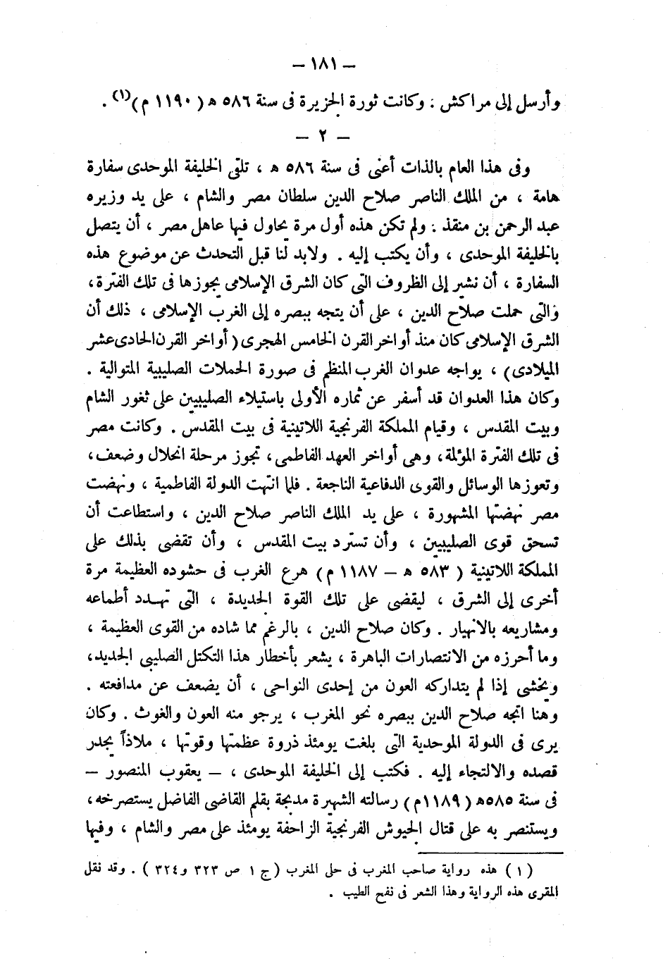 وفي هذا العام بالذات أعني في سنة 586 هـ، تلقى الخليفة الموحدي سفارة هامة، من الملك الناصر صلاح الدين سلطان مصر والشام، على يد وزيره عبد الرحمن بن منقذ، ولم تكن هذه أول مرة يحاول فيها عاهل مصر، أن يتصل بالخليفة الموحدي، وأن يكتب إليه. ولابد لنا قبل التحدث عن موضوع هذه السفارة، أن نشير إلى الظروف التي كان الشرق الإسلامي يجوزها في تلك الفترة، والتي حملت صلاح الدين، على أن يتجه ببصره إلى الغرب الإسلامي، ذلك أن الشرق الإسلامي كان منذ أواخر القرن الخامس الهجرى (أواخر القرن الحادي عشر الميلادى)، يواجه عدوان الغرب المنظم في صورة الحملات الصليبية المتوالية.