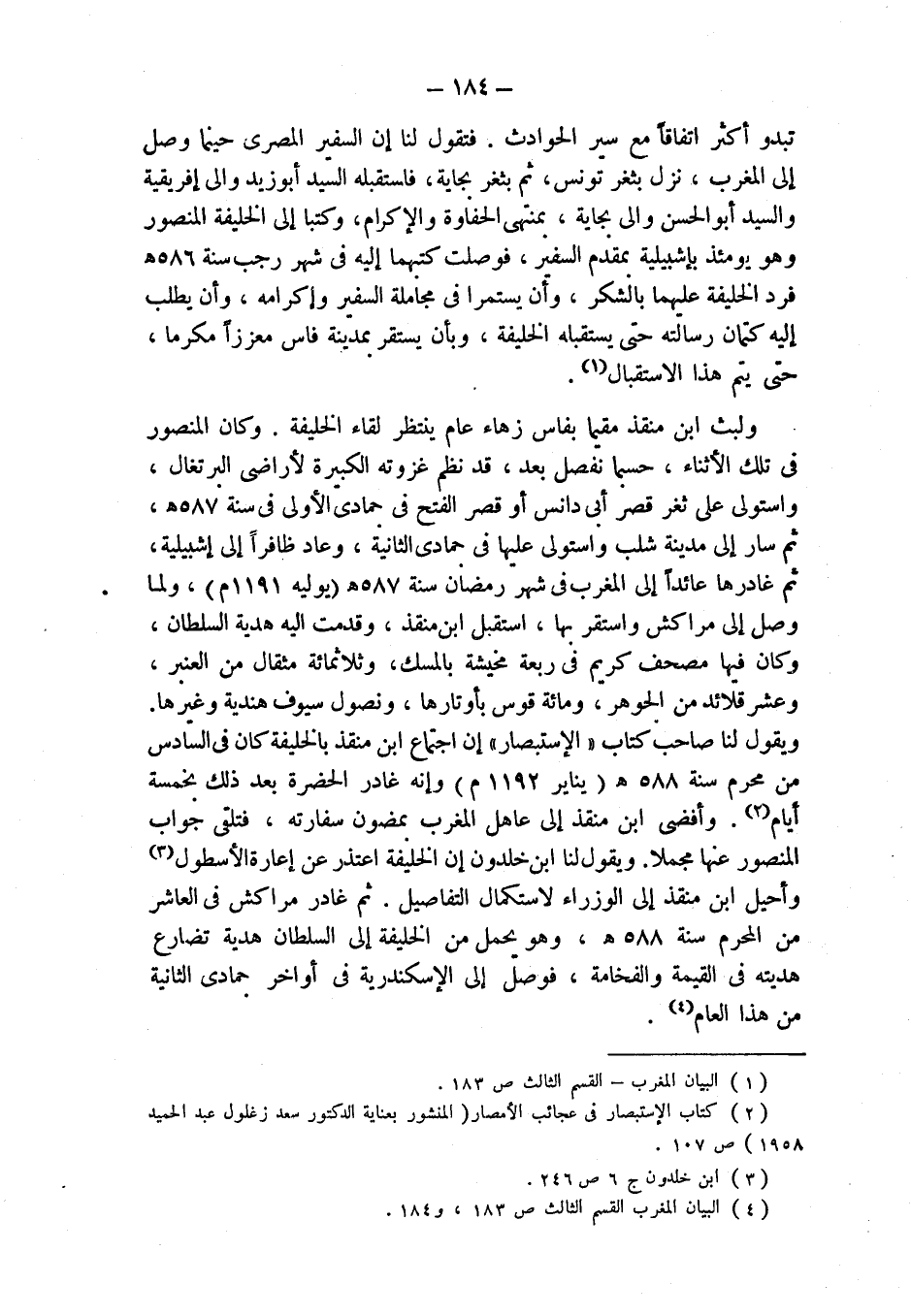ويقول لنا صاحب كتاب " الإستبصار " إن اجتماع ابن منقذ بالخليفة كان في السادس من محرم سنة 588 هـ (يناير 1192 م) وإنه غادر الحضرة بعد ذلك بخمسة أيام (¬2). وأفضى ابن منقذ إلى عاهل المغرب بمضمون سفارته، فتلقى جواب المنصور عنها مجملا. ويقول لنا ابن خلدون إن الخليفة اعتذر عن إعارة الأسطول (¬3) وأحيل ابن منقذ إلى الوزراء لاستكمال التفاصيل. ثم غادر مراكش في العاشر من المحرم سنة 588 هـ، وهو يحمل من الخليفة إلى السلطان هدية تضارع هديته في القيمة والفخامة، فوصل إلى الإسكندرية في أواخر جمادى الثانية من هذا العام (¬4).