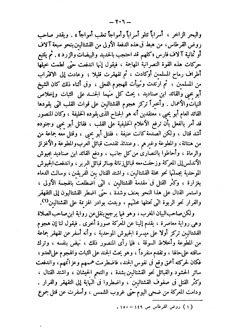 والبحر الزاخر، أسراباً تتلو أسراباً وأمواجاً تعقب أمواجاً ". ويقدر صاحب روض القرطاس، من هبط في هذه الدفعة الأولى من القشتاليين بنحو سبعة آلاف أو ثمانية آلاف فارس " كلهم قد احتجب بالحديد والبيضات والزرد ". ثم يتتبع حركات هذه القوة النصرانية المهاجمة، فيقول إنها اندفعت حتى لطمت خيلها أطراف رماح المسلمين أو كادت، ثم تقهقرت قليلا، وعادت إلى الاقتراب من المسلمين، ثم ارتدت وتهيأت للهجوم الفعلي، وفي أثناء ذلك كان الشيخ أبو يحيى والقائد ابن صناديد، يحث كل منهما الجند على الثبات وإخلاص النيات والأعمال. وأخيراً تركز هجوم القشتاليين على قوات القلب التي يقودها القائد العام أبو يحيى، معتقدين أنه هو الجناح الذي يقوده الخليفة، وكان المنصور قد أمر بالفعل بأن ترفع الأعلام الخليفية على القلب، فقاتل أبو يحيى وجنوده أشد قتال، ولكن الصدمة كانت عنيفة، فقتل أبو يحيى، وقتل معه جماعة من من هنتانة، والمطوعة وغيرهم. وعندئذ تقدمت قبائل العرب والمطوعة والأغزاز والرماة، وأحاطوا بالنصارى من كل جانب، ودفع القائد ابن صناديد بجيوش الأندلس إلى المعركة وزحفت معه قبائل زناتة وسائر قبائل البربر، واندفعت الجيوش الموحدية بجملتها نحو محلة القشتاليين، واشتد القتال بين الفريقين، وسالت الدماء بغزارة، وكثر القتل في مقدمة القشتاليين، التي اضطلعت بالهجمة الأولى، واستمر القتال على هذا النحو بعنف وشدة، حتى اضطر القشتاليون إلى التقهقر والفرار نحو الربوة التي تحتلها محلتهم، وبدت بوادر الهزيمة على القشتاليين (¬1).
