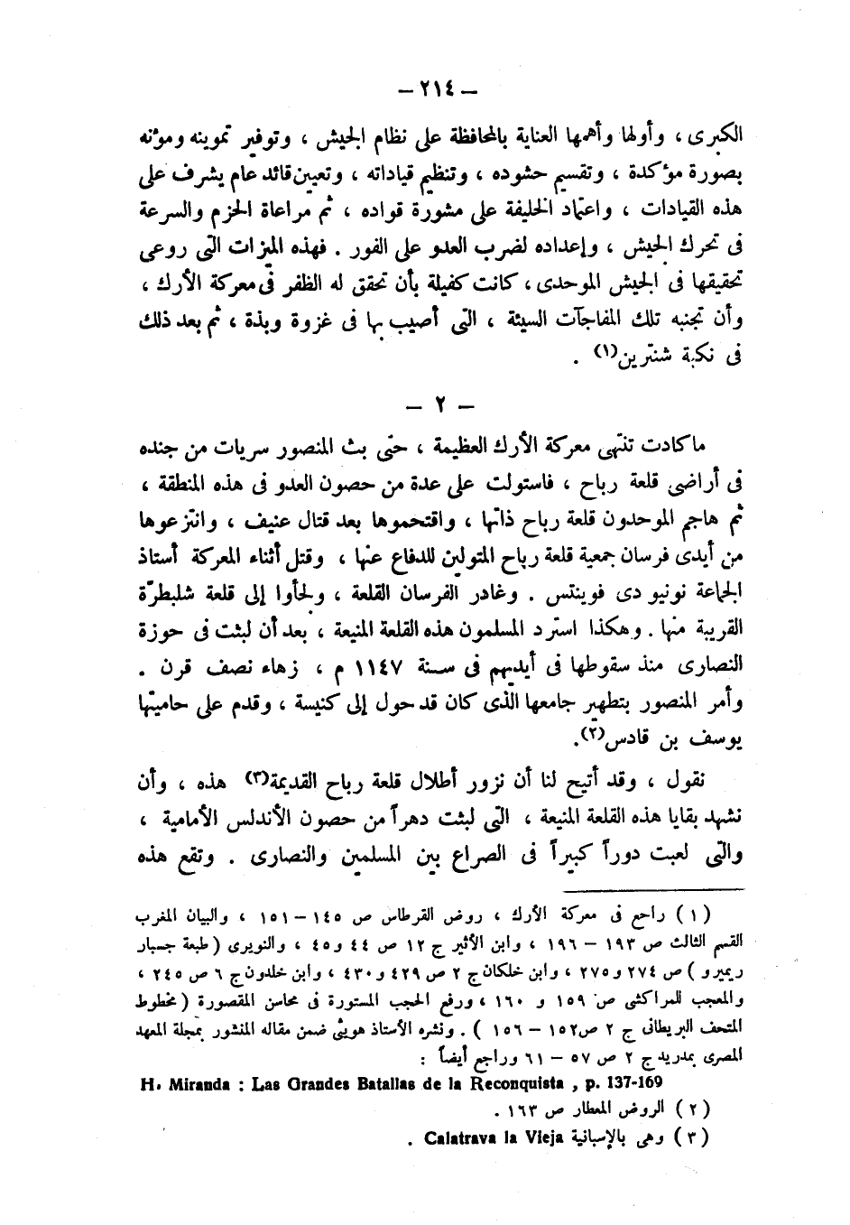(¬1) راجع في معركة الأرك، روض القرطاس ص 145 - 151، والبيان المغرب القسم الثالث ص 193 - 196، وابن الأثير ج 12 ص 44 و 45، والنويري (طبعة جسبار ريميرو) ص 274 و 275، وابن خلكان ج 2 ص 429 و 430، وابن خلدون ج 6 ص 245، والمعجب للمراكشي ص 159 و 160، ورفع الحجب المستورة في محاسن المقصورة (مخطوط المتحف البريطاني ج 2 ص 152 - 156). ونشره الأستاذ هويثي ضمن مقاله المنشور بمجلة المعهد المصري بمدريد ج 2 ص 57 - 61 وراجع أيضاً: