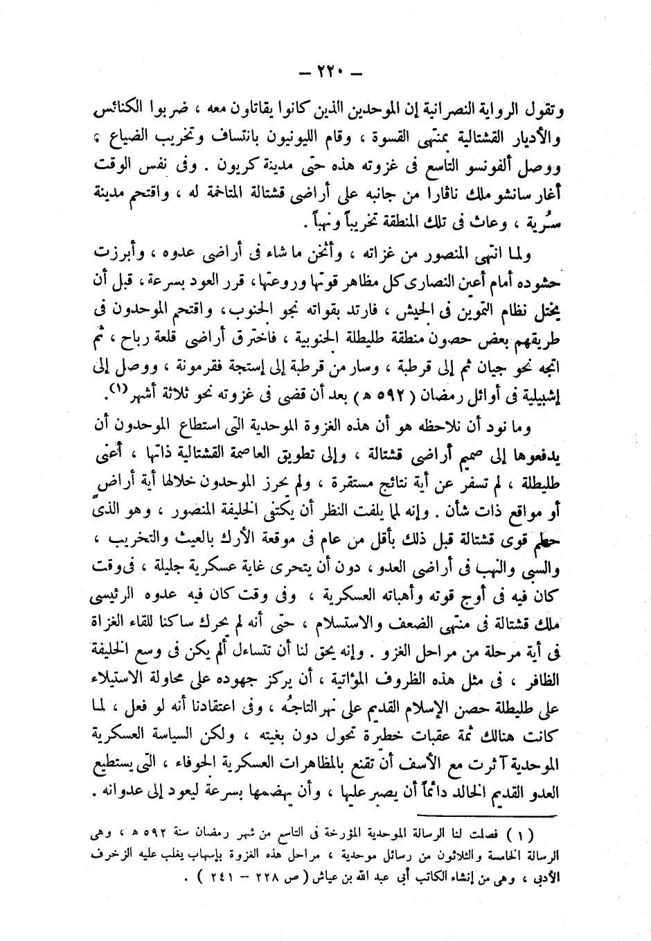 (¬1) فصلت لنا الرسالة الموحدية المؤرخة في التاسع من شهر رمضان سنة 592 هـ، وهي الرسالة الخامسة والثلاثون من رسائل موحدية، مراحل هذه الغزوة بإسهاب يغلب عليه الزخرف الأدبي، وهي من إنشاء الكاتب أبي عبد الله بن عياش (ص 228 - 241).
