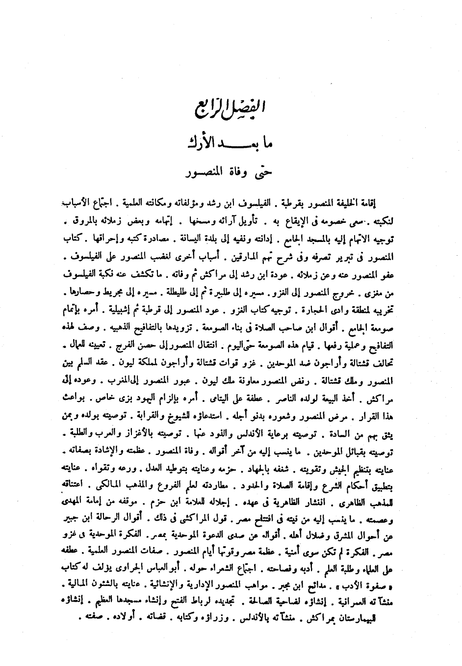 إقامة الخليفة المنصور بقرطبة. الفيلسوف ابن رشد ومؤلفاته ومكانته العلمية. اجتماع الأسباب لنكبته. سعي خصومه في الإيقاع به. تأويل آرائه ومسخها. إتهامه وبعض زملائه بالمروق. توجيه الاتهام إليه بالمسجد الجامع. إدانته ونفيه إلى بلدة اليسانة. مصادرة كتبه وإحراقها. كتاب المنصور في تبرير تصرفه وفي شرح تهم المارقين. أسباب أخرى لغضب المنصور على الفيلسوف. عفو المنصور عنه وعن زملائه. عودة ابن رشد إلى مراكش ثم وفاته. ما تكشف عنه نكبة الفيلسوف من مغزى. خروج المنصور إلى الغزو. مسيره إلى طلبيرة ثم إلى طليطلة. مسيره إلى مجريط وحصارها. تخريبه لمنطقة وادي الحجارة. توجيه كتاب الغزو. عود المنصور إلى قرطبة ثم إشبيلية. أمره بإتمام صومعة الجامع. أقوال ابن صاحب الصلاة في بناء الصومعة. تزويدها بالتفافيح الذهبية. وصف لهذه التفافيح وعملية رفعها. قيام هذه الصومعة حتى اليوم. انتقال المنصور إلى حصن الفرج. تعيينه للعمال. تحالف قشتالة وأراجون ضد الموحدين. غزو قوات قشتالة وأراجون لمملكة ليون. عقد السلم بين المنصور وملك قشتالة. رفض المنصور معاونة ملك ليون. عبور المنصور إلى المغرب. وعوده إلى مراكش. أخذ البيعة لولده الناصر. عطفه على اليتامى. أمره لإلزام اليهود بزي خاص. بواعث هذا القرار. مرض المنصور وشعوره بدنو أجله. استدعاؤه للشيوخ والقرابة. توصيته بولده وبمن يثق بهم من السادة. توصيته برعاية الأندلس والذود عنها. توصيته بالأغزاز والعرب والطلبة. ْتوصيته بقبائل الموحدين. ما ينسب إليه من آخر أقواله. وفاة المنصور. عظمته والإشادة بصفاته. عنايته بتنظيم الجيش وتقويته. شغفه بالجهاد. حزمه وعنايته بتوطيد العدل. ورعه وتقواه. عنايته بتطبيق أحكام الشرع وإقامة الصلاة والحدود. مطاردته لعلم الفروع والمذهب المالكي. اعتناقه للمذهب الظاهري. انتشار الظاهرية في عهده. إجلاله للعلامة ابن حزم. موقفه من إمامة المهدي وعصمته. ما ينسب إليه من نيته في افتتاح مصر. قول المراكشي في ذلك. أقوال الرحالة ابن جبير عن أحوال الشرق وضلال أهله. أقواله عن صدى الدعوة الموحدية بمصر. الفكرة الموحدية في غزو مصر. الفكرة لم تكن سوى أمنية. عظمة مصر وقوتها أيام المنصور. صفات المنصور العلمية. عطفه على العلماء وطلبة العلم. أدبه وفصاحته. اجتماع الشعراء حوله. أبو العباس الجراوي يؤلف له كتاب " صفوة الأدب ". مدائح ابن مجبر. مواهب المنصور الإدارية والإنشائية. عنايته بالشئون المالية. منشآته العمرانية. إنشاؤه لضاحية الصالحة. تجديده لرباط الفتح وإنشاء مسجدها العظيم. إنشاؤه البيمارستان بمراكش. منشآته بالأندلس. وزراؤه وكتابه. قضاته. أولاده. صفته.