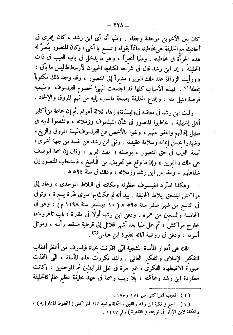 (¬2) راجع في نكبة ابن رشد " الذيل والتكملة " لعبد الملك المراكشي (المخطوط المشار إليه)، والتكملة لابن الأبار في ترجمته (القاهرة) رقم 1497.