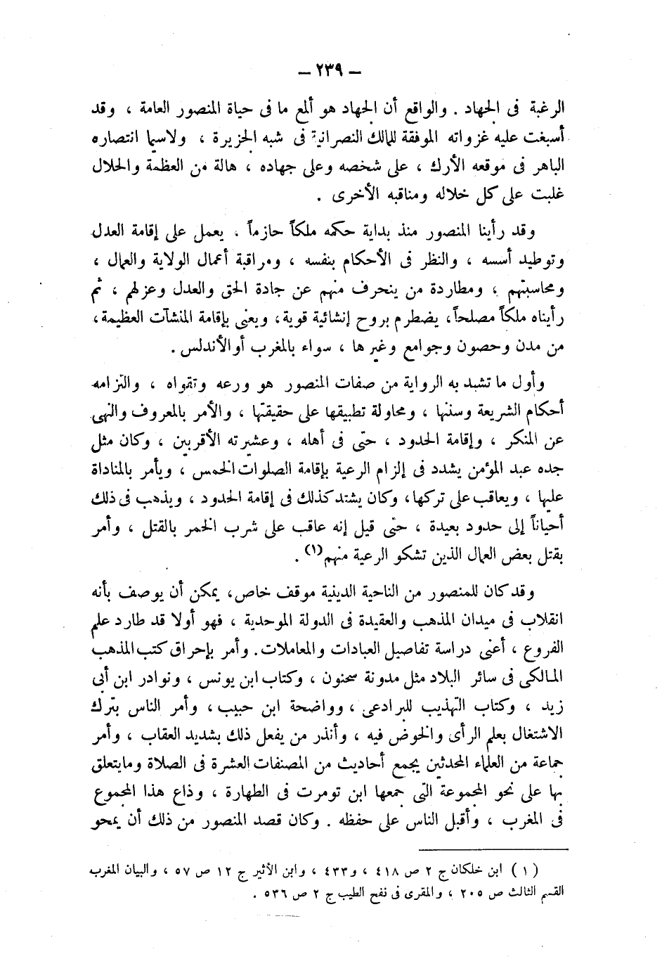 الرغبة فى الجهاد. والواقع أن الجهاد هو ألمع ما فى حياة المنصور العامة، وقد أسبغت عليه غزواته الموفقة للممالك النصرانية فى شبه الجزيرة، ولاسيما انتصاره الباهر فى موقعة الأرك، على شخصه وعلى جهاده، هالة من العظمة والجلال غلبت على كل خلاله ومناقبه الأخرى.