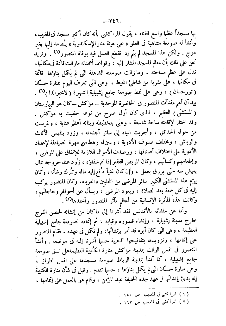 بها مسجداً عظيماً واسع الفناء، يقول المراكشي بأنه كان أكبر مسجد في المغرب، وأنشأ له صومعة متناهية في العلو " على هيئة منار الإسكندرية " يُصعد إليها بغير درج. ولكن هذا المسجد لم يتم إذ انقطع العمل فيه بوفاة المنصور (¬1). ونزيد نحن على ذلك بأن معالم المسجد المشار إليه، وقواعد أعمدته مازالت قائمة في مكانها، تدل على عظم مساحته، وما زالت صومعته الشاهقة التي لم يكمل بناؤها قائمة في مكانها، على مقربة من شاطىء المحيط، وهي التي تعرف اليوم بمنارة حسّان (تور حسان)، وهي على نمط صومعة جامع إشبيلية الشهيرة (لاخيرالدا) (1). بيد أن أهم منشآت المنصور في الحاضرة الموحدية - مراكش - كان هو البيمارستان (المستشفى) العظيم، الذي كان أول صرح من نوعه حظيت به مراكش. وقد اختار لإقامته ساحة شاسعة، وعنى بتخطيطه وبنائه أعظم عناية، وغرست من حوله الحدائق، وأجريت المياه إلى سائر أجنحته، وزود بنفيس الأثاث والرياش، ومختلف صنوف الأدوية، وعين له رهط من مهرة الصيادلة لإعداد الأدوية على اختلاف أصنافها، ورصدت الأموال اللازمة للإنفاق على المرضى، وإطعامهم وكسائهم، وكان المريض الفقير إذا تم شفاؤه، زُود عند خروجه بمال يعيش منه حتى يرزق بعمل، وإن كان غنياً دُفع إليه ماله وتُرك وشأنه، وكان يؤم هذا المستشفى الكبير سائر المرضى من المحليين والغرباء، وكان المنصور يركب إليه في كل جمعة بعد الصلاة، ويعود المرضى، ويسأل عن أحوالهم وحاجاتهم، وكانت هذه المأثرة الإنسانية من أعظم مآثر المنصور وأخلدها (¬2).