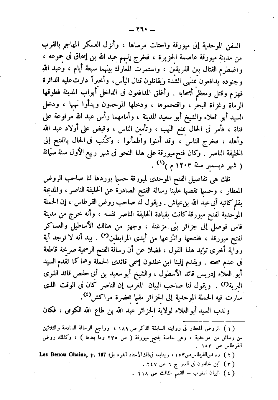 (¬1) الروض المعطار في روايته السابقة الذكر ص 189، وراجع الرسالة السادسة والثلاثين من رسائل موحدية، وهي خاصة بفتح ميورقة (ص 235 وما بعدها)، وكذلك روض القرطاس ص 153.