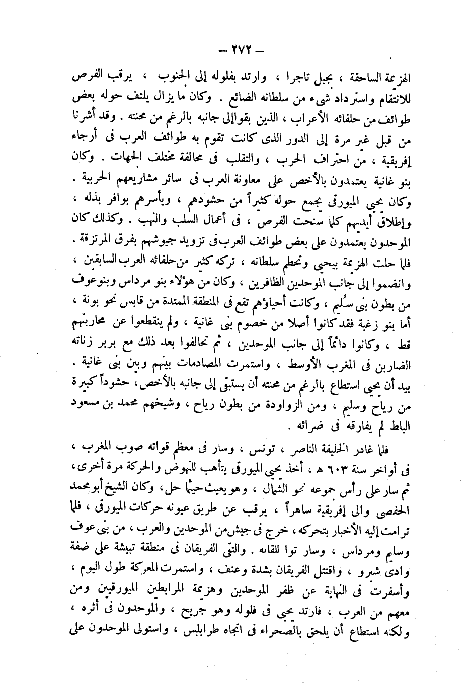 الهزيمة الساحقة، بجبل تاجرا، وارتد بفلوله إلى الجنوب، يرقب الفرص للانتقام واسترداد شىء من سلطانه الضائع. وكان ما يزال يلتف حوله بعض طوائف من حلفائه الأعراب، الذين بقوا إلى جانبه بالرغم من محنته. وقد أشرنا من قبل غير مرة إلى الدور الذي كانت تقوم به طوائف العرب في أرجاء إفريقية، من احتراف الحرب، والتقلب في محالفة مختلف الجهات. وكان بنو غانية يعتمدون بالأخص على معاونة العرب في سائر مشاريعهم الحربية. وكان يحيى الميورقي يجمع حوله كثيراً من حشودهم، ويأسرهم بوافر بذله، وإطلاق أيديهم كلما سنحت الفرص، في أعمال السلب والنهب. وكذلك كان الموحدون يعتمدون على بعض طوائف العرب في تزويد جيوشهم بفرق المرتزقة. فلما حلت الهزيمة بيحيى وتحطم سلطانه، تركه كثير من حلفائه العرب السابقين، وانضموا إلى جانب الموحدين الظافرين، وكان من هؤلاء بنو مرداس وبنو عوف من بطون بني سُليم، وكانت أحياؤهم تقع في المنطقة الممتدة من قابس نحو بونة، أما بنو زغبة فقد كانوا أصلا من خصوم بني غانية، ولم ينقطعوا عن محاربتهم قط، وكانوا دائماً إلى جانب الموحدين، ثم تحالفوا بعد ذلك مع بربر زناته الضاربين في المغرب الأوسط، واستمرت المصادمات بينهم وبين بني غانية. بيد أن يحيى استطاع بالرغم من محنته أن يستبقى إلى جانبه بالأخص، حشوداً كبيرة من رياح وسليم، ومن الزواودة من بطون رياح، وشيخهم محمد بن مسعود البلط لم يفارقه في ضرائه.