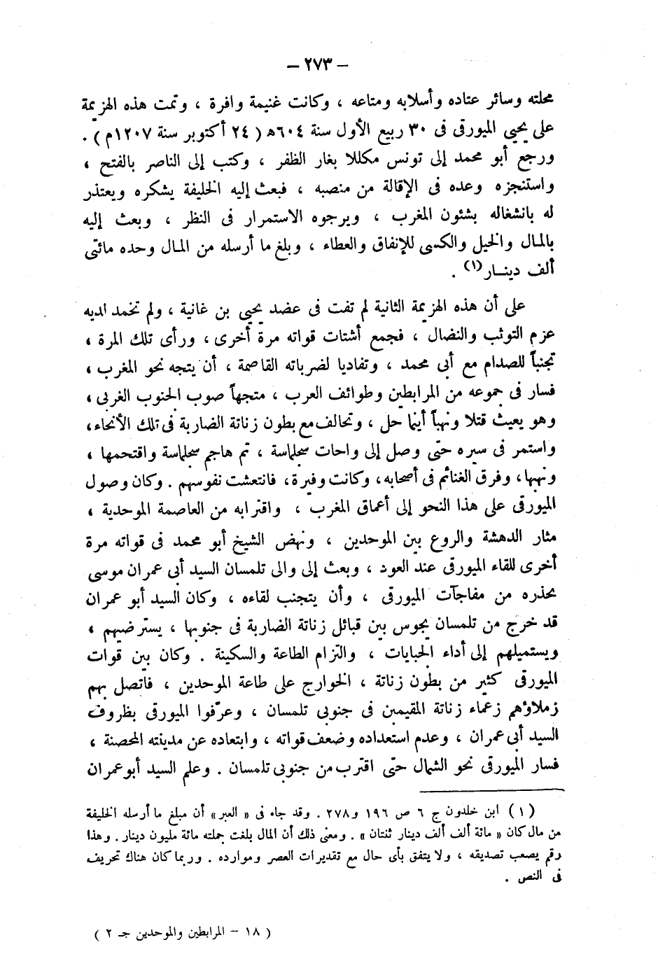 (¬1) ابن خلدون ج 6 ص 196 و 278. وقد جاء في " العبر " أن مبلغ ما أرسله الخليفة من مال كان " مائة ألف ألف دينار ثنتان ". ومعنى ذلك أن المال بلغت جملته مائة مليون دينار. وهذا رقم يصعب تصديقه، ولا يتفق بأي حال مع تقديرات العصر وموارده. وربما كان هناك تحريف في النص.