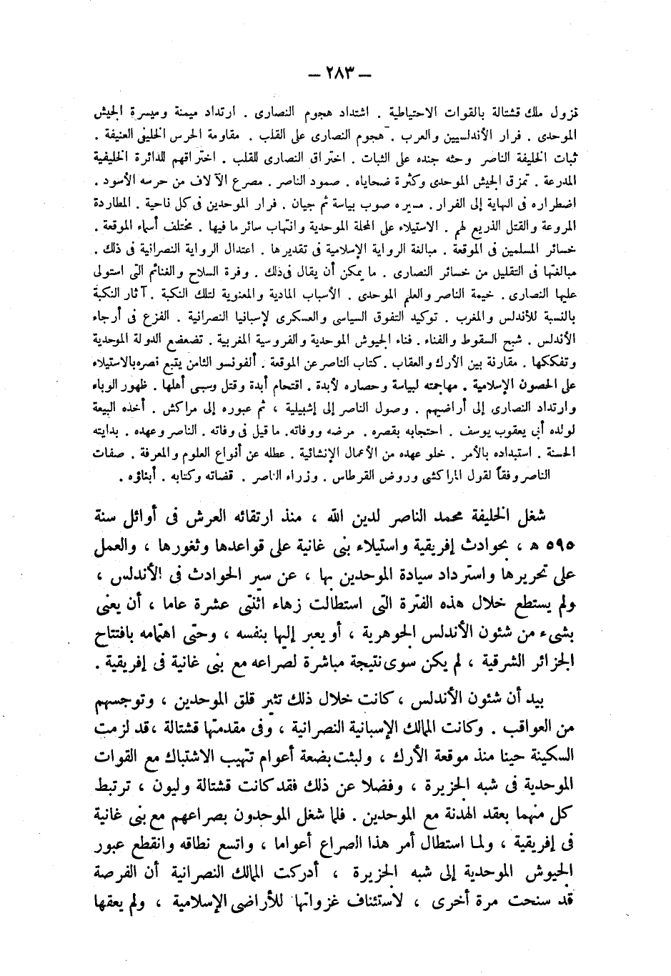 نزول ملك قشتالة بالقوات الاحتياطية. اشتداد هجوم النصارى. ارتداد ميمنة وميسرة الجيش الموحدي. فرار الأندلسيين والعرب. هجوم النصارى على القلب. مقاومة الحرس الخليفى العنيفة. ثبات الخليفة الناصر وحثه جنده على الثبات. اختراق النصارى للقلب. اختراقهم للدائرة الخليفية المدرعة. تمزق الجيش الموحدي وكثرة ضحاياه. صمود الناصر. مصرع الآلاف من حرسه الأسود. اضطراره في النهاية إلى الفرار. مسيره صوب بياسة ثم جيان. فرار الموحدين في كل ناحية. المطاردة المروعة والقتل الذريع لهم. الاستيلاء على المحلة الموحدية وانتهاب سائر ما فيها. مختلف أسماء الموقعة. خسائر المسلمين في الموقعة. مبالغة الرواية الإسلامية في تقديرها. اعتدال الرواية النصرانية في ذلك. مبالغتها في التقليل من خسائر النصارى. ما يمكن أن يقال في ذلك. وفرة السلاح والغنائم التي استولى عليها النصارى. خيمة الناصر والعلم الموحدي. الأسباب المادية والمعنوية لتلك النكبة. آثار النكبة بالنسبة للأندلس والمغرب. توكيد التفوق السياسي والعسكرى لإسبانيا النصرانية. الفزع في أرجاء الأندلس. شبح السقوط والفناء. فناء الجيوش الموحدية والفروسية المغربية. تضعضع الدولة الموحدية وتفككها. مقارنة بين الأرك والعقاب. كتاب الناصر عن الموقعة. ألفونسو الثامن يتبع نصره بالاستيلاء على الحصون الإسلامية. مهاجمته لبياسة وحصاره لأبدة. اقتحام أبدة وقتل وسبى أهلها. ظهور الوباء وارتداد النصارى إلى أراضيهم. وصول الناصر إلى إشبيلية، ثم عبوره إلى مراكش. أخذه البيعة لولده أبي يعقوب يوسف. احتجابه بقصره. مرضه ووفاته. ما قيل في وفاته. الناصر وعهده. بدايته الحسنة. استبداده بالأمر. خلو عهده من الأعمال الإنشائية. عطله عن أنواع العلوم والمعرفة. صفات الناصر وفقاً لقول المراكشي وروض القرطاس. وزراء الناصر. قضاته وكتابه. أبناؤه.