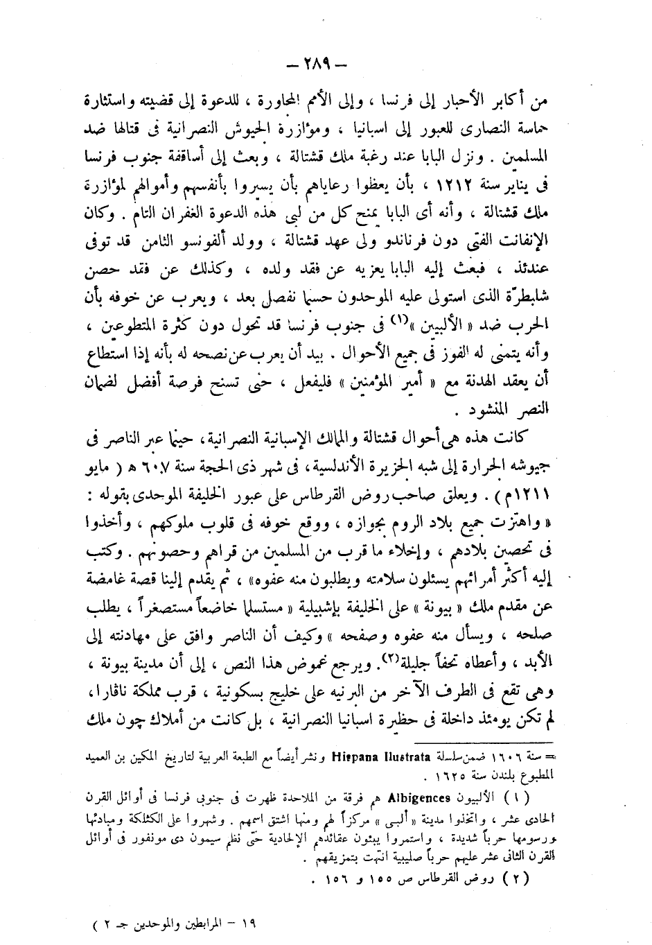 من أكابر الأحبار إلى فرنسا، وإلى الأمم المجاورة، للدعوة إلى قضيته واستثارة حماسة النصارى للعبور إلى اسبانيا، ومؤازرة الجيوش النصرانية في قتالها ضد المسلمين. ونزل البابا عند رغبة ملك قشتالة، وبعث إلى أساقفة جنوب فرنسا في يناير سنة 1212، بأن يعظوا رعاياهم بأن يسيروا بأنفسهم وأموالهم لمؤازرة ملك قشتالة، وأنه أي البابات يمنح من لبى هذه الدعوة الغفران التام. وكان الإنفانت الفتى دون فرناندو ولى عهد قشتالة، وولد ألفونسو الثامن قد توفي عندئذ، فبعث إليه البابا يعزيه عن فقد ولده، وكذلك عن فقد حصن شلبطرّة الذي استولى عليه الموحدون حسبما نفصل بعد، ويعرب عن خوفه بأن الحرب ضد " الألبيين " (¬1) في جنوب فرنسا قد تحول دون كثرة المتطوعين، وأنه يتمنى له الفوز في جميع الأحوال. بيد أنه يعرب عن نصحه له بأنه إذا استطاع أن يعقد الهدنة مع " أمير المؤمنين " فليفعل، حتى تسنح فرصة أفضل لضمان النصر المنشود.