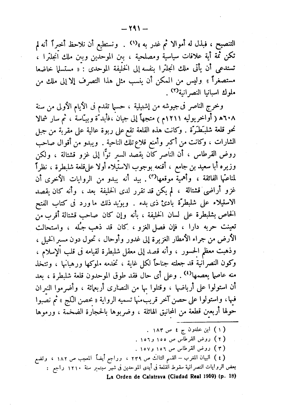 (¬4) البيان المغرب - القسم الثالث ص 239، وراجع أيضاً المعجب ص 182، وتضع بعض الروايات النصرانية سقوط القلعة في أيدي الموحدين في شهر سبتمبر سنة 1210 راجع: