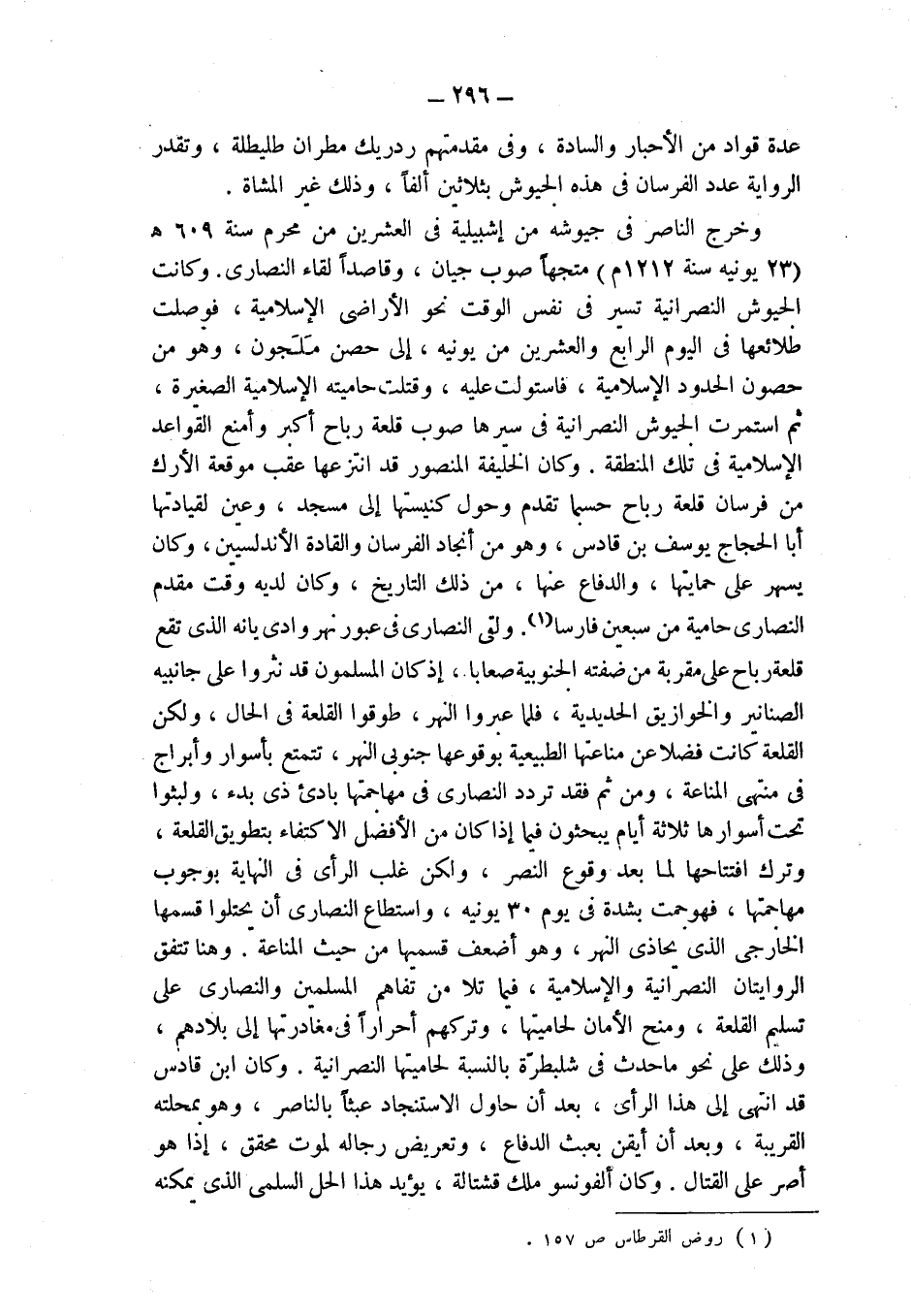 وخرج الناصر في جيوشه من إشبيلية في العشرين من محرم سنة 609 هـ (23 يونيه سنة 1212 م) متجهاً صوب جيان، وقاصداً لقاء النصارى. وكانت الجيوش النصرانية تسير في نفس الوقت نحو الأراضي الإسلامية، فوصلت طلائعها في اليوم الرابع والعشرين من يونيه، إلى حصن مَلَجون، وهو من حصون الحدود الإسلامية، فاستولت عليه، وقتلت حاميته الإسلامية الصغيرة، ثم استمرت الجيوش النصرانية في سيرها صوب قلعة رباح أكبر وأمنع القواعد الإسلامية في تلك المنطقة. وكان الخليفة المنصور قد انتزعها عقب موقعة الأرك من فرسان قلعة رباح حسبما تقدم وحول كنيسها إلى مسجد، وعين لقيادتها أبا الحجاج يوسف بن قادس، وهو من أنجاد الفرسان والقادة الأندلسيين، وكان يسهر على حمايتها، والدفاع عنها، من ذلك التاريخ، وكان لديه وقت مقدم النصارى حامية من سبعين فارساً (¬1). ولقى النصارى في عبور نهر وادي يانه الذي تقع قلعة رباح على مقربة من ضفته الجنوبية صعاباً، إذ كان المسلمون قد نثروا على جانبيه الصنانير والخوازيق الحديدية، فلما عبروا النهر، طوقوا القلعة في الحال، ولكن القلعة كانت فضلا عن مناعتها الطبيعية بوقوعها جنوبي النهر، تتمتع بأسوار وأبراج في منتهى المناعة، ومن ثم فقد تردد النصارى في مهاجمتها بادىء ذي بدء، ولبثوا تحت أسوارها ثلاثة أيام يبحثون فيما إذا كان من الأفضل الاكتفاء بتطويق القلعة، وترك افتتاحها لما بعد وقوع النصر، ولكن غلب الرأي في النهاية بوجوب مهاجمتها، فهوجمت بشدة في يوم 30 يونيه، واستطاع النصارى أن يحتلوا قسمها الخارجي الذي يحاذى النهر، وهو أضعف قسميها من حيث المناعة. وهنا تتفق الروايتان النصرانية والإسلامية، فيما تلا من تفاهم المسلمين والنصارى على تسليم القلعة، ومنح الأمان لحاميتها، وتركهم أحراراً في مغادرتها إلى بلادهم، وذلك على نحو ما حدث في شلبطرّة بالنسبة لحاميتها النصرانية. وكان ابن قادس قد انتهى إلى هذا الرأي، بعد أن حاول الاستنجاد عبثاً بالناصر، وهو بمحلته القريبة، وبعد أن أيقن بعبث الدفاع، وتعريض رجاله لموت محقق، إذا هو أصر على القتال. وكان ألفونسو ملك قشتالة، يؤيد هذا الحل السلمى الذي يمكنه