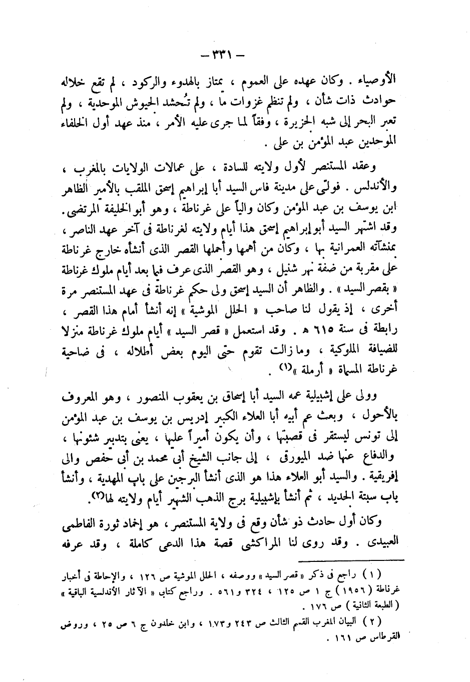 (¬1) راجع في ذكر " قصر السيد " ووصفه، الحلل الموشية ص 126، والإحاطة في أخبار غرناطة (1956) ج 1 ص 125، 324 و 561. وراجع كتابى " الآثار الأندلسية الباقية " (الطبعة الثانية) ص 176.