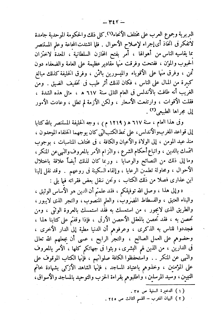 وفي هذا العام، سنة 617 هـ (1219 م)، وجه الخليفة المستنصر بالله كتابا إلى قواعد المغرب والأندلس، على نمط الكتب التي كان يوجهها الخلفاء الموحدون، منذ عبد المؤمن، إلى الولاة والأعيان والكافة، في مختلف المناسبات، بوجوب التمسك بالدين، واتباع أحكام الشرع، والتزام الأمر بالمعروف والنهى عن المنكر، وما إلى ذلك من النصائح والوصايا، وربما كان لذلك أيضاً علاقة باختلال الأحوال، ومحاولة تطمين الرعايا، وإلقاء السكينة في روعهم. وقد نقل إلينا ابن عذارى فصلا من ذلك الكتاب، ونحن ننقل بعض فقراته فيما يلي: