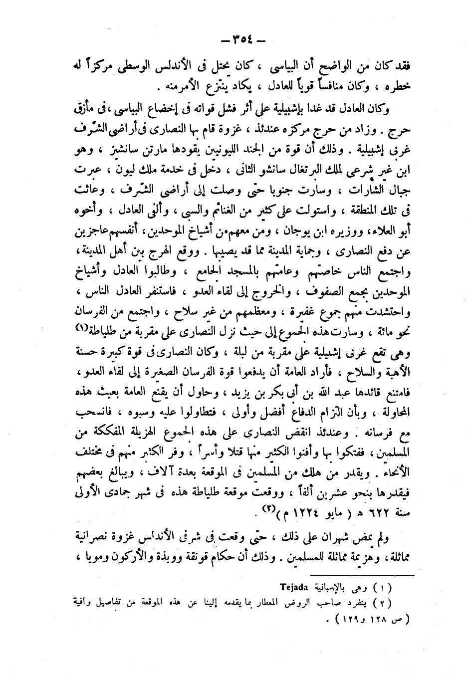 وكان العادل قد غدا بإشبيلية على أثر فشل قواته في إخضاع البياسى، في مأزق حرج. وزاد من حرج مركزه عندئذ، غزوة قام بها النصارى في أراضي الشّرف غربي إشبيلية. وذلك أن قوة من الجند الليونيين يقودها مارتن سانشيز، وهو ابن غير شرعى لملك البرتغال سانشو الثاني، دخل في خدمة ملك ليون، عبرت جبال الشارات، وسارت جنوبا حتى وصلت إلى أراضي الشّرف، وعاثت في تلك المنطقة، واستولت على كثير من الغنائم والسبي، وألفى العادل، وأخوه أبو العلاء، ووزيره ابن يوجان، ومن معهم من أشياخ الموحدين، أنفسهم عاجزين عن دفع النصارى، وحماية المدينة مما قد يصيبها. ووقع الهرج بين أهل المدينة، واجتمع الناس خاصتهم وعامتهم بالمسجد الجامع، وطالبوا العادل وأشياخ الموحدين بجمع الصفوف، والخروج إلى لقاء العدو، فاستنفر العادل الناس، واحتشدت مهم جموع غفيرة، ومعظمهم من غير سلاح، واجتمع من الفرسان نحو مائة، وسارت هذه الجموع إلى حيث نزل النصارى على مقربة من طلياطة (¬1) وهي تقع غربي إشبيلية على مقربة من لبلة، وكان النصارى في قوة كبيرة حسنة الأهبة والسلاح، فأراد العامة أن يدفعوا قوة الفرسان الصغيرة إلى لقاء العدو، فامتنع قائدها عبد الله بن أبي بكر بن يزيد، وحاول أن يقنع العامة بعبث هذه المحاولة، وبأن التزام الدفاع أفضل وأولى، فتطاولوا عليه وسبوه، فانسحب مع فرسانه. وعندئذ أنقض النصارى على هذه الجموع الهزيلة المفككة من المسلمين، ففتكوا بها وأفنوا الكثير منها قتلا وأسراً، وفر الكثير منهم في مختلف الأنحاء. ويقدر من هلك من المسلمين في الموقعة بعدة آلاف، ويبالغ بعضهم فيقدرها بنحو عشرين ألفاً، ووقعت موقعة طلياطة هذه في شهر جمادى الأولى سنة 622 هـ (مايو 1224 م) (¬2).