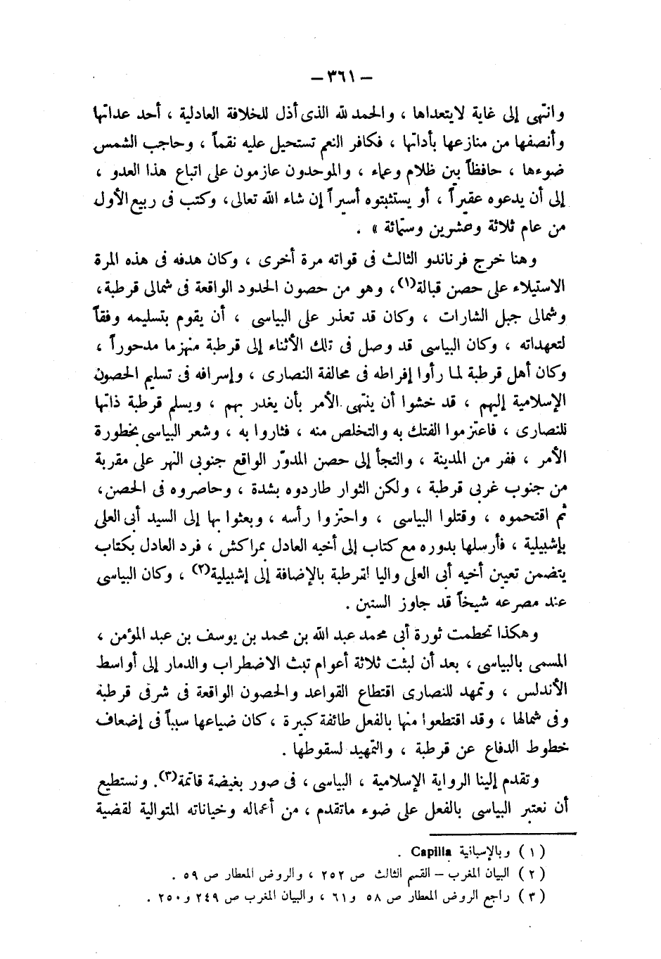 وهكذا تحطمت ثورة أبي محمد عبد الله بن محمد بن يوسف بن عبد المؤمن، المسمى بالبياسى، بعد أن لبثت ثلاثة أعوام تبث الاضطراب والدمار إلى أواسط الأندلس، وتمهد للنصارى اقتطاع القواعد والحصون الواقعة في شرقي قرطبة وفي شمالها، وقد اقتطعوا منها بالفعل طائفة كبيرة، كان ضياعها سبباً في إضعاف خطوط الدفاع عن قرطبة، والتمهيد لسقوطها. وتقدم إلينا الرواية الإسلامية، البياسى، في صور بغيضة قاتمة (¬3). ونستطيع أن نعتبر البياسى بالفعل على ضوء ما تقدم، من أعماله وخياناته المتوالية لقضية