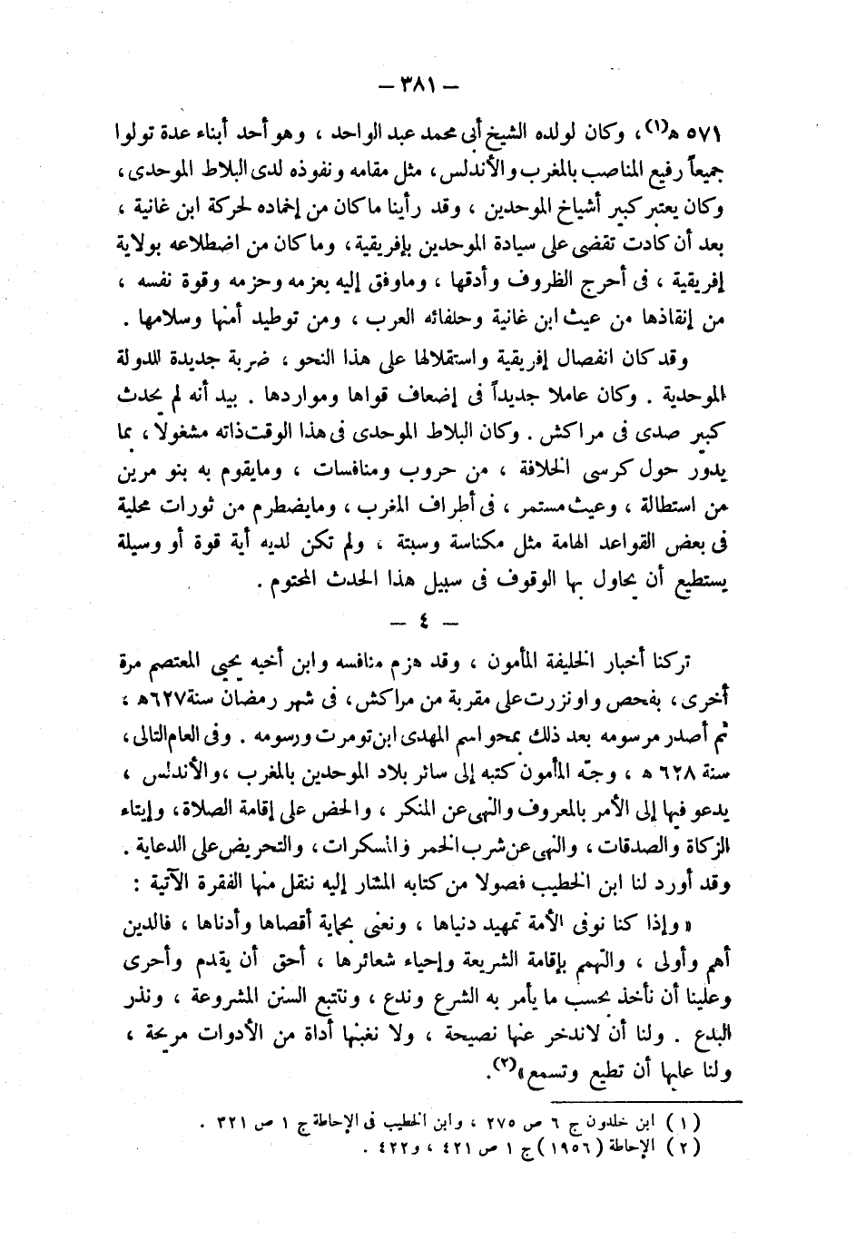 تركنا أخبار الخليفة المأمون، وقد هزم منافسه وابن أخيه يحيى المعتصم مرة أخرى، بفحص واونزرت على مقربة من مراكش، في شهر رمضان سنة 627 هـ، ثم أصدر مرسومه بعد ذلك بمحو اسم المهدي ابن تومرت ورسومه. وفي العام التالي، سنة 628 هـ، وجّه المأمون كتبه إلى سائر بلاد الموحدين بالمغرب، والأندلس، يدعو فيها إلى الأمر بالمعروف والنهى عن المنكر، والحض على إقامة الصلاة، وإيتاء الزكاة والصدقات، والنهى عن شرب الخمر والمسكرات، والتحريض على الدعاية. وقد أورد لنا ابن الخطيب فصولا من كتابه المشار إليه ننقل منها الفقرة الآتية: " وإذا كنا نوفى الأمة تمهيد دنياها، ونعنى بحماية أقصاها وأدناها، فالدين أهم وأولى، والتهمم بإقامة الشريعة وإحياء شعائرها، أحق أن يقدم وأحرى وعلينا أن نأخذ بحسب ما يأمر به الشرع وندع، ونتتبع السنن المشروعة، ونذر البدع. ولنا أن لا ندخر عنها نصيحة، ولا نغبنها أداة من الأدوات مريحة، ولنا عليها أن تطيع وتسمع " (¬2).