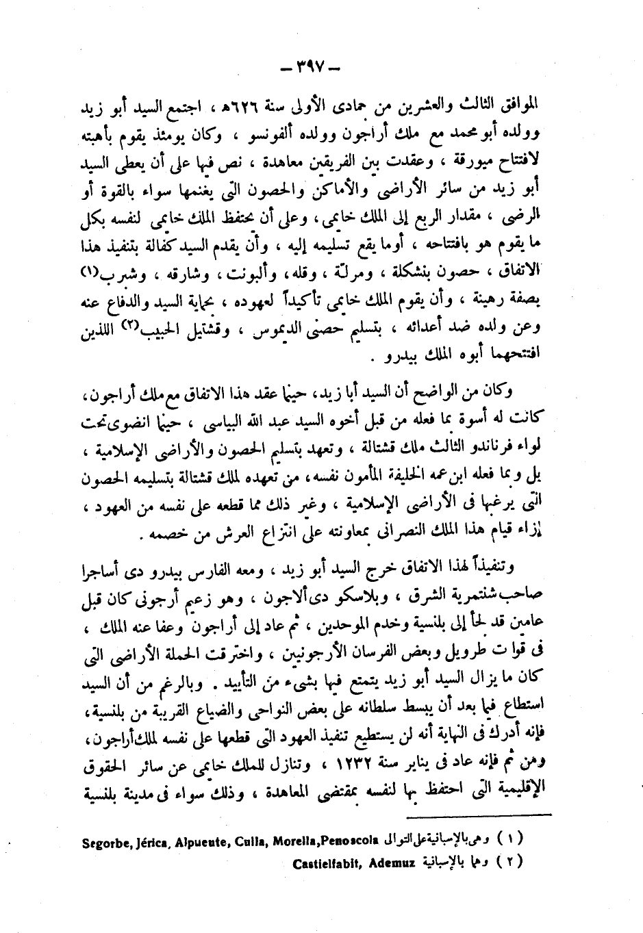 الموافق الثالث والعشرين من جمادى الأولى سنة 626 هـ، اجتمع السيد أبو زيد وولده أبو محمد مع ملك أراجون وولده ألفونسو، وكان يومئذ يقوم بأهبته لافتتاح ميورقة، وعقدت بين الفريقين معاهدة، نص فيها على أن يعطى السيد أبو زيد من سائر الأراضي والأماكن والحصون التي يغنمها سواء بالقوة أو الرضى، مقدار الربع إلى الملك خايمى، وعلى أن يحتفظ الملك خايمى لنفسه بكل ما يقوم هو بافتتاحه، أو ما يقع تسليمه إليه، وأن يقدم السيد كفالة بتنفيذ هذا ْالاتفاق، حصون بنشكلة، ومرلّة، وقله، وألبونت، وشارقه، وشبرب (¬1) بصفة رهينة، وأن يقوم الملك خايمى تأكيداً لعهوده، بحماية السيد والدفاع عنه وعن ولده ضد أعدائه، بتسليم حصنى الديموس، وقشتيل الحبيب (¬2) اللذين افتتحهما أبوه الملك بيدرو.
