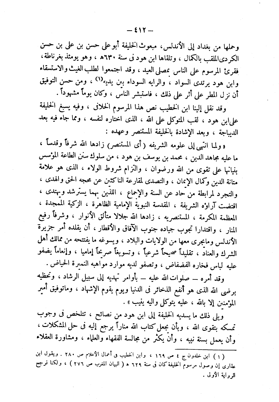 وقد نقل إلينا ابن الخطيب نص هذا المرسوم الخلافي، وفيه يسبغ الخليفة على ابن هود، لقب المتوكل على الله، الذي اختاره لنفسه، ومما جاء فيه بعد الديباجة، وبعد الإشادة بالخليفة المستنصر وعهده: " ولما انتهى إلى علومه الشريفه (أي المستنصر) زادها الله شرفاً وقدساً، ما عليه مجاهد الدين، محمد بن يوسف بن هود، من سلوك سنن الطاعة المؤسس بنيانها على تقوى من الله ورضوان، والتزام شروط الولاء، الذي هو علامة متانة الدين وكمال الإيمان، والتصدى لمقارعة الناكثين عن محجة الحق والهدى، والتجرد لمرابطة من حاد عن السنة والإجماع، اللذين بهما يسترشد ويهتدى، اقتضت آراؤه الشريفة، المقدسة النبوية الإمامية الظاهرة، الزكية الممجدة، المعظمة المكرمة، المستنصرية، زادها الله جلالا متألق الأنوار، وشرفاً رفيع المنار، واقتدارا تجوب جياده جنوب الآفاق والأقطار، أن يقلده أمر جزيرة الأندلس وما يجرى معها من الولايات والبلاد، ويسوغه ما يفتتحه من ممالك أهل الشرك والعناد، تقليداً صحيحاً شرعياً، وتسويغاً صريحاً إمامياً، وإنعاماً يضفو عليه لباس فخاره الفضفاض، وتصفو لديه موارد مواهبه النميرة الحياض.