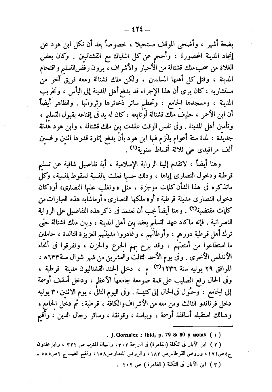 وهنا أيضاً، لا تقدم إلينا الرواية الإسلامية، أية تفاصيل شافية عن تسليم قرطبة ودخول النصارى إياها، وذلك حسبما فعلت بالنسبة لسقوط بلنسية، وكل ما تذكره في هذا الشأن كلمات موجزة، مثل " وتغلب عليها النصارى " أو " كان دخول النصارى مدينة قرطبة " أو " ملكها النصارى " أو ما شابه هذه العبارات من كلمات مقتضبة (¬2). وهنا أيضاً يجب أن نعتمد في ذكر هذه التفاصيل على الرواية النصرانية. فإنه ما كاد عهد التسليم يعقد بين أهل المدينة، وبين ملك قشتالة حتى ترك أهل قرطبة دورهم، وأوطانهم، وغادروا مدينتهم العزيزة التالدة، حاملين ما استطاعوا من أمتعتهم، وقد برح بهم الجوع والحزن، وتفرقوا في أنحاء الأندلس الأخرى. وفي يوم الأحد الثالث والعشرين من شهر شوال سنة 633 هـ، الموافق 29 يونيه سنة 1236 م (¬3)، دخل الجند القشتاليون مدينة قرطبة، وفي الحال رفع الصليب على قمة صومعة جامعها الأعظم، ودخل أسقف أوسمة إلى الجامع، وحُول في الحال إلى كنيسة. وفي اليوم التالي، يوم الاثنين 30 يونيه دخل فرناندو الثالث ومن معه من الأشراف والكافة، قرطبة، ثم دخل الجامع، وهنالك استقبله أساقفة أوسمة، وبياسة، وقونقة، وسائر رجال الدين، وأقيم