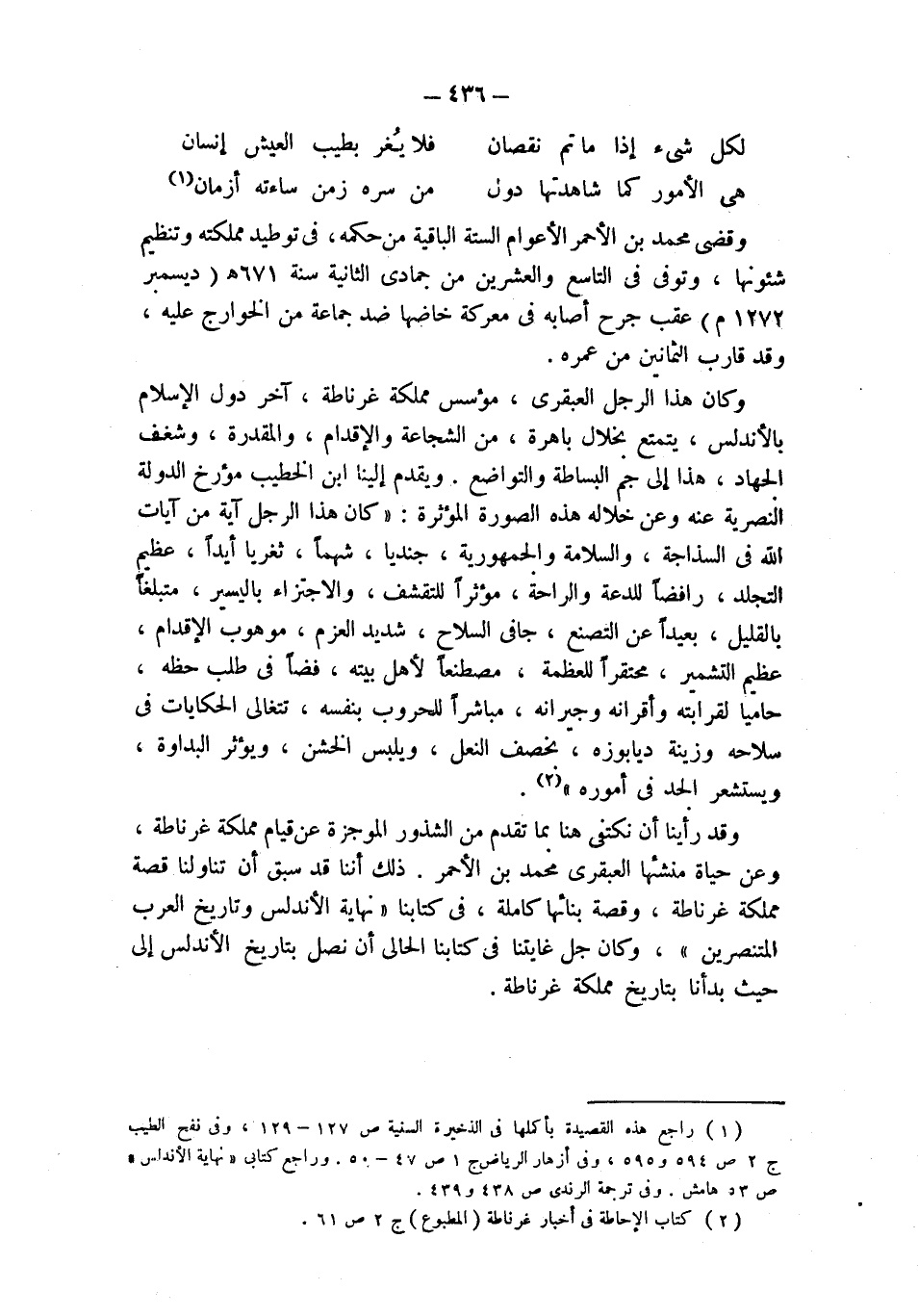 وقد رأينا أن نكتفى هنا بما تقدم من الشذور الموجزة عن قيام مملكة غرناطة، وعن حياة منشئها العبقري محمد بن الأحمر. ذلك أننا قد سبق أن تناولنا قصة مملكة غرناطة، وقصة بنائها كاملة، في كتابنا " نهاية الأندلس وتاريخ العرب المتنصرين "، وكان جل غايتنا في كتابنا الحالى أن نصل بتاريخ الأندلس إلى حيث بدأنا بتاريخ مملكة غرناطة.