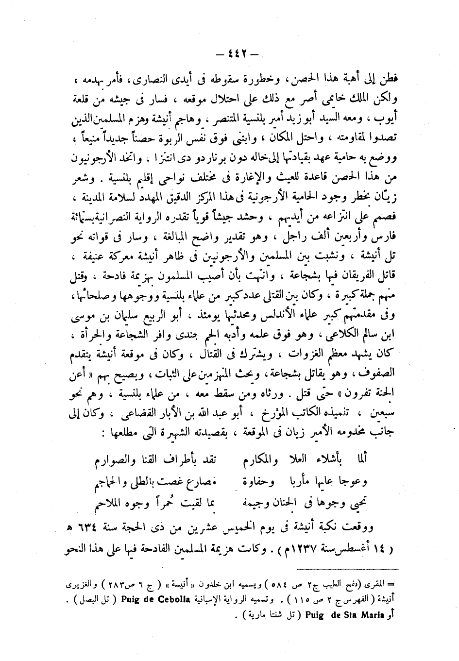 = المقري (نفح الطيب ج 2 ص 584) ويسميه ابن خلدون " أنيسة " (ج 6 ص 283) والغزيري أنيشة (الفهرس ج 2 ص 115). وتسميه الرواية الإسبانية Puig de Cebolla ( تل البصل). أو Puig de Sta Maria ( تل شنتا مارية).