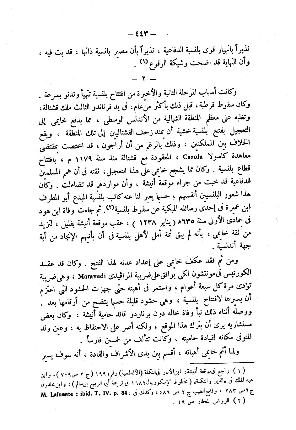 (¬1) راجع في موقعة أنيشة: ابن الأبار في التكملة (الأندلسية) رقم 1991 (ج 2 ص 709)، وابن عبد الملك في "الذيل والتكملة" (مخطوط الإسكوريال 1682 في ترجمة أبي الربيع بن سالم)، وابن خلدون ج 6 ص 283، ونفح الطيب ج 2 ص 586، وكذلك في: M. Lafuente ; ibid. T. IV. p. 84