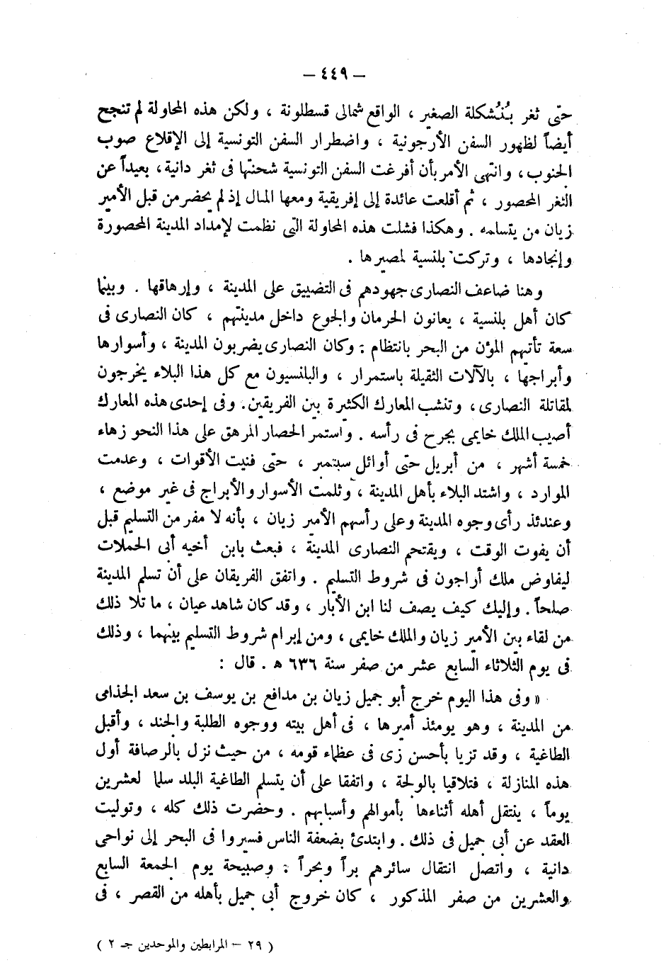 " وفي هذا اليوم خرج أبو جميل زيان بن مدافع بن يوسف بن سعد الجذامى من المدينة، وهو يومئذ أميرها، في أهل بيته ووجوه الطلبة والجند، وأقبل الطاغية، وقد تزيا بأحسن زى في عظماء قومه، من حيث نزل بالرصافة أول هذه المنازلة، فتلاقيا بالولجة، واتفقا على أن يتسلم الطاغية البلد سلما لعشرين يوماً، ينتقل أهله أثناءها بأموالهم وأسبابهم. وحضرت ذلك كله، وتوليت العقد عن أبي جميل في ذلك. وابتدئ بضعفة الناس فسيروا في البحر إلى نواحي دانية، واتصل انتقال سائرهم براً وبحراً. وصبيحة يوم الجمعة السابع والعشرين من صفر المذكور، كان خروج أبي جميل بأهله من القصر، في