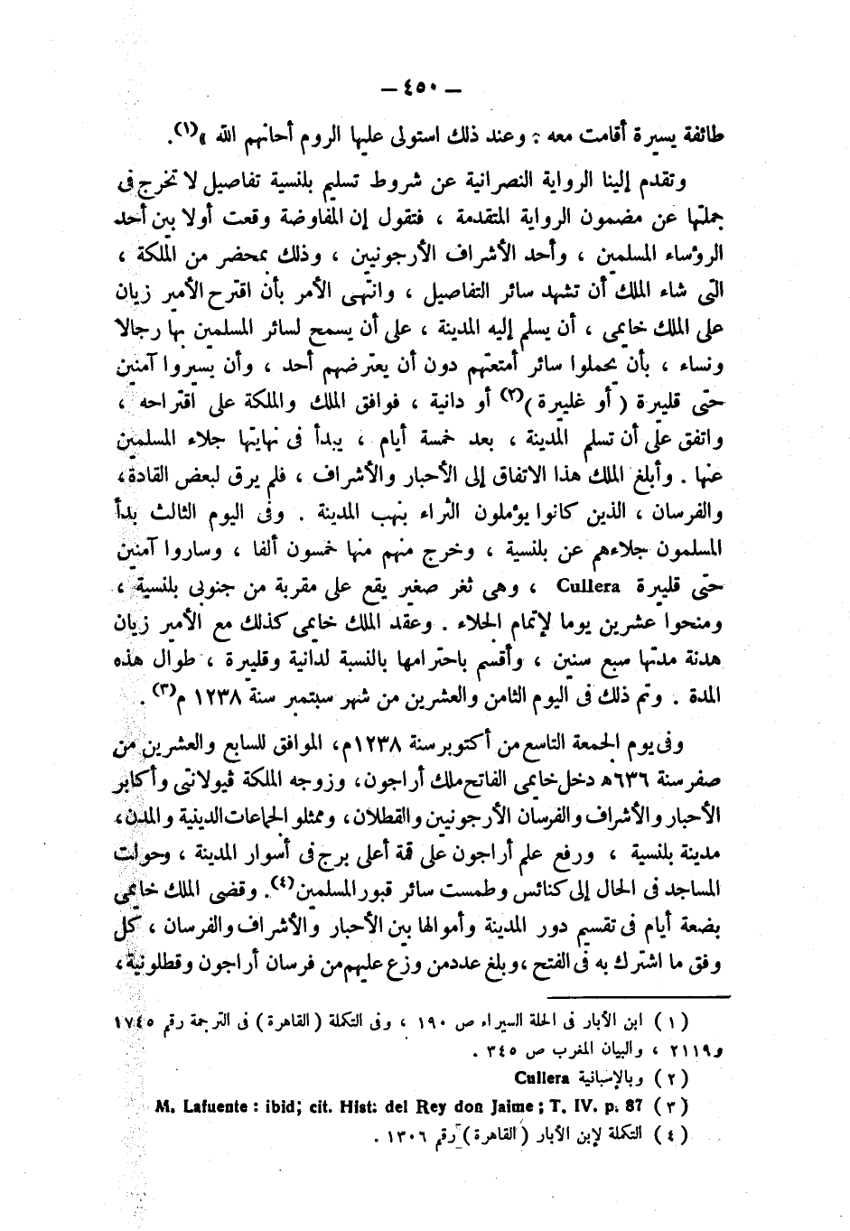 وتقدم إلينا الرواية النصرانية عن شروط تسليم بلنسية تفاصيل لا تخرج في جملتها عن مضمون الرواية المتقدمة، فتقول إن المفاوضة وقعت أولا بين أحد الرؤساء المسلمين، وأحد الأشراف الأرجونيين، وذلك بمحضر من الملكة، التي شاء الملك أن تشهد سائر التفاصيل، وانتهى الأمر بأن اقترح الأمير زيان على الملك خايمى، أن يسلم إليه المدينة، على أن يسمح لسائر المسلمين بها رجالا ونساء، بأن يحملوا سائر أمتعتهم دون أن يعترضهم أحد، وأن يسيروا آمنين ْحتى قلييرة (أو غلييرة) (¬2) أو دانية، فوافق الملك والملكة على اقتراحه، واتفق على أن تسلم المدينة، بعد خمسة أيام، يبدأ في نهايتها جلاء المسلمين عنها. وأبلغ الملك هذا الاتفاق إلى الأحبار والأشراف، فلم يرق لبعض القادة، والفرسان، الذين كانوا يؤملون الثراء بنهب المدينة. وفي اليوم الثالث بدأ المسلمون جلاءهم عن بلنسية، وخرج منهم منها خمسون ألفا، وساروا آمنين حتى قلييرة Cullera، وهي ثغر صغير يقع على مقربة من جنوبي بلنسية، ومنحوا عشرين يوما لإتمام الجلاء. وعقد الملك خايمى كذلك مع الأمير زيان هدنة مدتها سبع سنين، وأقسم باحترامها بالنسبة لدانية وقلييرة، طوال هذه المدة. وتم ذلك في اليوم الثامن والعشرين من شهر سبتمبر سنة 1238 م (¬3).