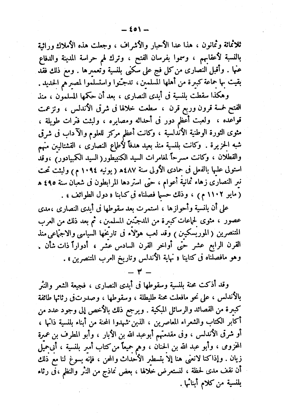 ثلاثمائة وثمانون، هذا عدا الأحبار والأشراف، وجعلت هذه الأملاك وراثية بالنسبة لأعقابهم، وسموا بفرسان الفتح، وترك لهم حراسة المدينة والدفاع عنها. وأقبل النصارى من كل فج على سكنى بلنسية وتعميرها. ومع ذلك فقد بقيت بها جماعة كبيرة من أهلها المسلمين، تدجّنوا واستسلموا لمصيرهم الجديد. وهكذا سقطت بلنسية في أيدي النصارى، بعد أن حكمها المسلمون، منذ الفتح خمسة قرون وربع قرن، سطعت خلالها في شرقي الأندلس، وتزعمت قواعده، ولعبت أعظم دور في أحداثه ومصايره، ولبثت فترات طويلة، مثوى الثورة الوطنية الأندلسية، وكانت أعظم مركز للعلوم والآداب في شرقي شبه الجزيرة. وكانت بلنسية منذ بعيد هدفاً لأطماع النصارى، القشتاليين منهم والقطلان، وكانت مسرحاً لمغامرات السيد الكنبيطور (السيد الكمبيادور)، وقد استولى عليها بالفعل في جمادى الأولى سنة 487 هـ (يونيه 1094 م) ولبثت تحت نير النصارى زهاء ثمانية أعوام، حتى استردها المرابطون في شعبان سنة 495 هـ (مايو 1102 م)، وذلك حسبما فصلناه في كتابنا " دول الطوائف ".