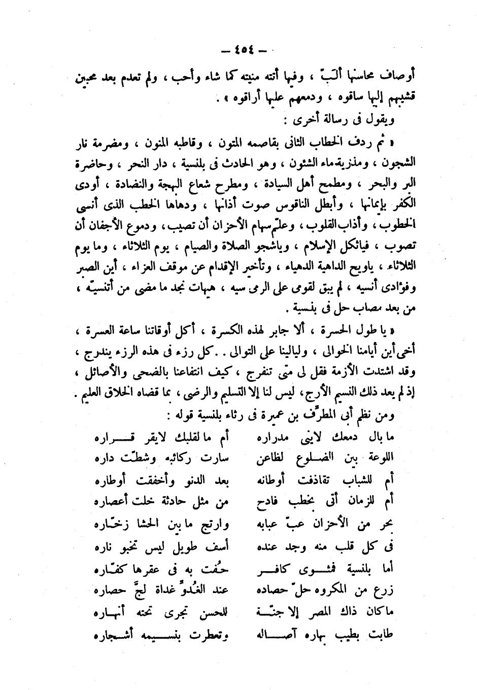 " يا طول الحسرة، ألا جابر لهذه الكسرة، أكل أوقاتنا ساعة العسرة، أخي أين أيامنا الخوالى، وليالينا على التوالى .. كل رزء في هذه الرزء يندرج، وقد اشتدت الأزمة فقل لي متى تنفرج، كيف انتفاعنا بالضحى والأصائل، إذ لك يعد ذلك النسيم الأرج، ليس لنا إلا التسليم والرضى، بما قضاه الخلاق العليم. ومن نظم أبي المطرِّف بن عميرة في رثاء بلنسية قوله: