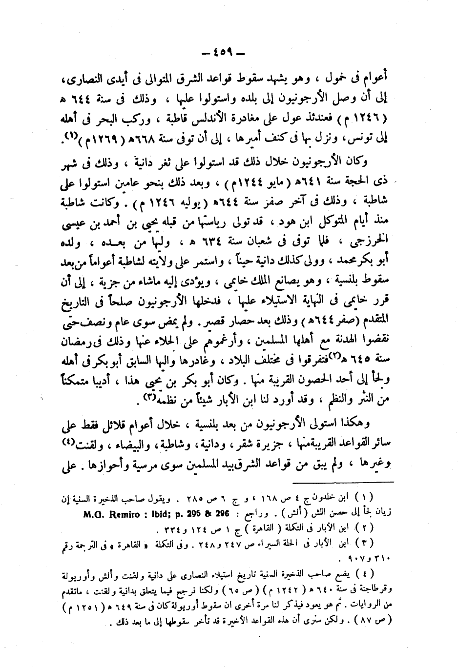 (¬4) يضع صاحب الذخيرة السنية تاريخ استيلاء النصارى على دانية ولقنت وألش وأوريولة وقرطاجنة في سنة 640 هـ (1242 م) (ص 65) ولكنا نرجح فيما يتعلق بدانية ولقنت، ما تقدم من الروايات. ثم هو يعود فيذكر لنا مرة أخرى أن سقوط أوريولة كان في سنة 649 هـ (1251 م) (ص 87). ولكن سنرى أن هذه القواعد الأخيرة قد تأخر سقوطها إلى ما بعد ذلك