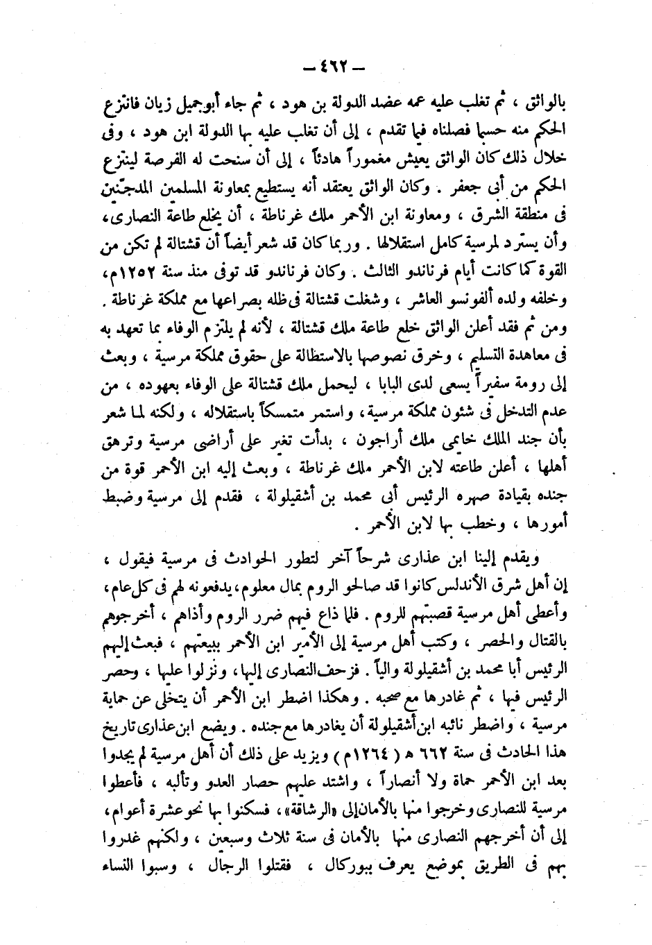 بالواثق، ثم تغلب عليه عمه عضد الدولة بن هود، ثم جاء أبو جميل زيان فانتزع الحكم منه حسبما فصلناه فيما تقدم، إلى أن تغلب عليه بهاء الدولة ابن هود، وفي خلال ذلك كان الواثق يعيش مغموراً هادئاً، إلى أن سنحت له الفرصة لينتزع الحكم من أبي جعفر. وكان الواثق يعتقد أنه يستطيع بمعاونة المسلمين المدجّنين في منطقة الشرق، ومعاونة ابن الأحمر ملك غرناطة، أن يخلع طاعة النصارى، وأن يسترد لمرسية كامل استقلالها. وربما كان قد شعر أيضاً أن قشتالة لم تكن من القوة كما كانت أيام فرناندو الثالث. وكان فرناندو قد توفي منذ سنة 1252 م، وخلفه ولده ألفونسو العاشر، وشغلت قشتالة في ظله بصراعها مع مملكة غرناطة. ومن ثم فقد أعلن الواثق خلع طاعة ملك قشتالة، لأنه لم يلتزم الوفاء بما تعهد به في معاهدة التسليم، وخرق نصوصها بالاستطالة على حقوق مملكة مرسية، وبعث إلى رومة سفيراً يسعى لدى البابا، ليحمل ملك قشتالة على الوفاء بعهوده، من عدم التدخل في شئون مملكة مرسية، واستمر متمسكاً باستقلاله، ولكنه لما شعر بأن جند الملك خايمى ملك أراجون، بدأت تغير على أراضي مرسية وترهق أهلها، أعلن طاعته لابن الأحمر ملك غرناطة، وبعث إليه ابن الأحمر قوة من جنده بقيادة صهره الرئيس أبي محمد بن أشقيلولة، فقدم إلى مرسية وضبط أمورها، وخطب بها لابن الأحمر.
