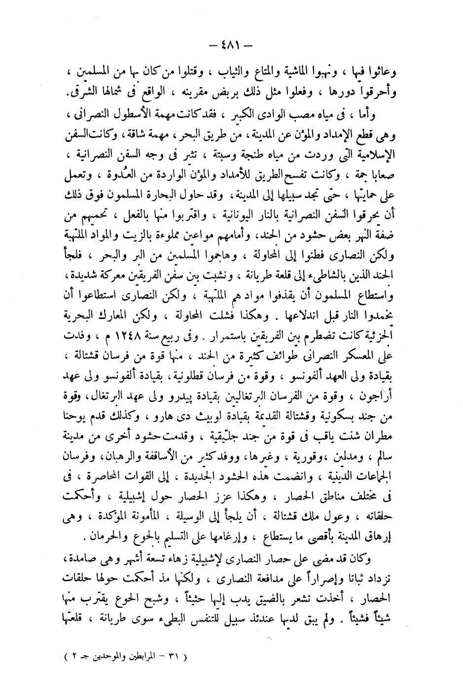 وعاثوا فيها، ونهبوا الماشية والمتاع والثياب، وقتلوا من كان بها من المسلمين، وأحرقوا دورها، وفعلوا مثل ذلك بربض مقرينه، الواقع في شمالها الشرقي. وأما، في مياه مصب الوادي الكبير، فقد كانت مهمة الأسطول النصراني، وهي قطع الإمداد والمؤن عن المدينة، من طريق البحر، مهمة شاقة، وكانت السفن الإسلامية التي وردت من مياه طنجة وسبتة، تثير في وجه السفن النصرانية، صعابا جمة، وكانت تفسح الطريق للأمداد والمؤن الواردة من العُدوة، وتعمل على حمايتها، حتى تجد سبيلها إلى المدينة، وقد حاول البحارة المسلمون فوق ذلك أن يحرقوا السفن النصرانية بالنار اليونانية، واقتربوا منها بالفعل، تحميهم من ضفة النهر بعض حشود من الجند، وأمامهم مواعين مملوءة بالزيت والمواد الملتهبة ولكن النصارى فطنوا إلى المحاولة، وهاجموا المسلمين من البر والبحر، فلجأ الجند الذين بالشاطىء إلى قلعة طريانة، ونشبت بين سفن الفريقين معركة شديدة، واستطاع المسلمون أن يقذفوا موادهم الملتهبة، ولكن النصارى استطاعوا أن يخمدوا النار قبل اندلاعها. وهكذا فشلت المحاولة، ولكن المعارك البحرية الجزئية كانت تضطرم بين الفريقين باستمرار. وفي ربيع سنة 1248 م، وفدت على المعسكر النصراني طوائف كثيرة من الجند، منها قوة من فرسان قشتالة، بقيادة ولى العهد ألفونسو، وقوة من فرسان قطلونية، بقيادة ألفونسو ولى عهد أراجون، وقوة من الفرسان البرتغاليين بقيادة بيدرو ولى عهد البرتغال، وقوة من جند بسكونية وقشتالة القديمة بقيادة لوبيث دي هارو، وكذلك قدم يوحنا مطران شنت ياقب في قوة من جند جلّيقية، قدمت حشود أخرى من مدينة سالم، ومدلين، وقورية، وغيرها، ووفد كثير من الأساقفة والرهبان، وفرسان الجماعات الدينية، وانضمت هذه الحشود الجديدة، إلى القوات المحاصرة، في مختلف مناطق الحصار، وهكذا عزز الحصار حول إشبيلية، وأحكمت حلقاته، وعول ملك قشتالة، أن يلجأ إلى الوسيلة، المأمونة المؤكدة، وهي إرهاق المدينة بأقصى ما يستطاع، وإرغامها على التسليم بالجوع والحرمان.