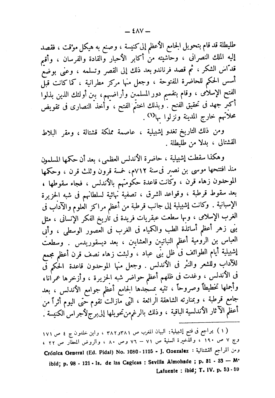 (¬1) يراجع في فتح إشبيلية: البيان المغرب ص 381 و 382، وابن خلدون ج 4 ص 171 وج 7 ص 190، والذخيرة السنية ص 71 - 76 وص 80، والروض المعطار ص 22، ومن المراجع القشتالية: Cronica General (Ed. Pidal) No. 1080 - 1125 - J. Gonzalez ibid ; p. 98 - 121 - Is. de las Cagicas: Sevilla Almohade ; p. 31 - 33 -- M. Lafuente: ibid ; T. IV. p. 53 - 59