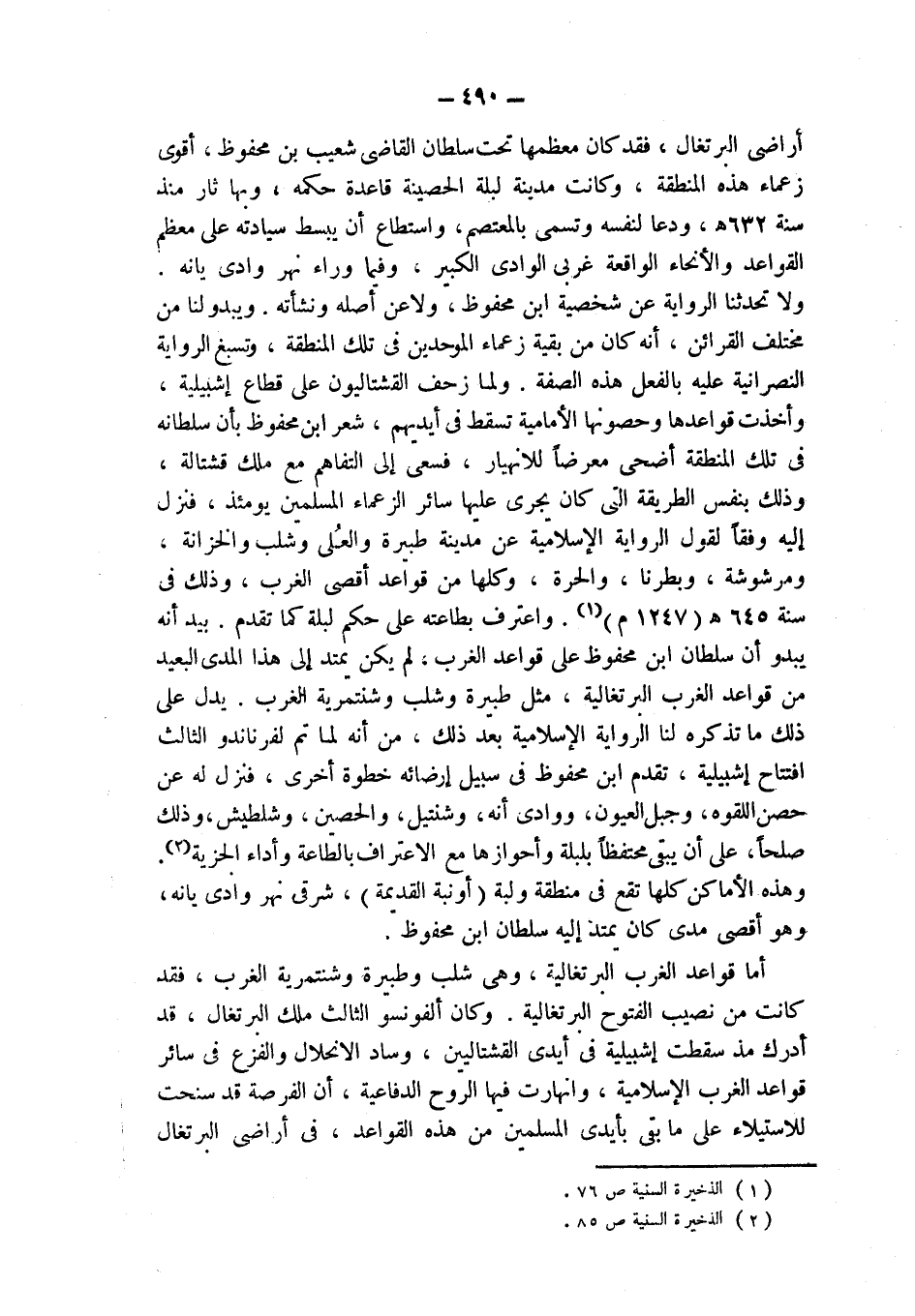 أراضي البرتغال، فقد كان معظمها تحت سلطان القاضي شعيب بن محفوظ، أقوى زعماء هذه المنطقة، وكانت مدينة لبلة الحصينة قاعدة حكمه، وبها ثار منذ سنة 632 هـ، ودعا لنفسه وتسمى بالمعتصم، واستطاع أن يبسط سيادته على معظم القواعد والأنحاء الواقعة غربي الوادي الكبير، وفيما وراء نهر وادي يانه. ولا تحدثنا الرواية عن شخصية ابن محفوظ، ولا عن أصله ونشأته. ويبدو لنا من مختلف القرائن، أنه كان من بقية زعماء الموحدين في تلك المنطقة، وتسبغ الرواية النصرانية عليه بالفعل هذه الصفة. ولما زحف القشتاليون على قطاع إشبيلية، وأخذت قواعدها وحصونها الأمامية تسقط في أيديهم، شعر ابن محفوظ بأن سلطانه في تلك المنطقة أضحى معرضاً للانهيار، فسعى إلى التفاهم مع ملك قشتالة، وذلك بنفس الطريقة التي كان يجرى عليها سائر الزعماء المسلمين يومئذ، فنزل إليه وفقاً لقول الرواية الإسلامية عن مدينة طبيرة والعُلى وشلب والخزانة، ومرشوشة، وبطرنا، والحرة، وكلها من قواعد أقصى الغرب، وذلك في سنة 645 هـ (1247 م) (¬1). واعترف بطاعته على حكم لبلة كما تقدم. بيد أنه يبدو أن سلطان ابن محفوظ على قواعد الغرب، لم يكن يمتد إلى هذا المدى البعيد من قواعد الغرب البرتغالية، مثل طبيرة وشلب وشنتمرية الغرب. يدل على ذلك ما تذكره لنا الرواية الإسلامية بعد ذلك، من أنه لما تم لفرناندو الثالث افتتاح إشبيلية، تقدم ابن محفوظ في سبيل إرضائه خطوة أخرى، فنزل له عن حصن اللقوه، وجبل العيون، ووادي أنه، وشنتيل، والحصين، وشلطيش، وذلك صلحاً، على أن يبقى محتفظاً بلبلة وأحوازها مع الاعتراف بالطاعة وأداء الجزية (¬2). وهذه الأماكن كلها تقع في منطقة ولبة (أونبة القديمة)، شرقي نهر وادي يانه، وهو أقصى مدى كان يمتد إليه سلطان ابن محفوظ.