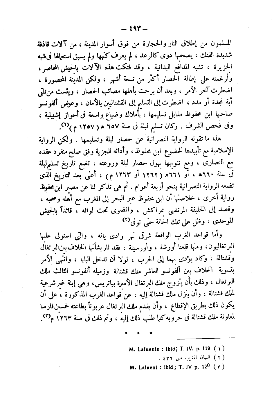 هذا ما تقوله الرواية النصرانية عن حصار لبلة وتسليمها. ولكن الرواية الإسلامية مع تأييدها لخضوع ابن محفوظ، وأدائه للجزية وفق صلح منفرد عقده مع النصارى، ومع تنويهها بهول حصار لبلة وروعته، تضع تاريخ تسليم لبلة في سنة 660 هـ، أو 661 هـ (1262 أو 1263 م)، أعني بعد التاريخ الذي تضعه الرواية النصرانية بنحو أربعة أعوام. ثم هي تذكر لنا عن مصير ابن محفوظ رواية أخرى، خلاصتها أن ابن محفوظ عبر البحر إلى المغرب مع أهله وصحبه، وقصد إلى الخليفة المرتضى بمراكش، وانضوى تحت لوائه، قائداً بالجيش الموحدي، وظل على تلك الحالة حتى توفي (¬2).